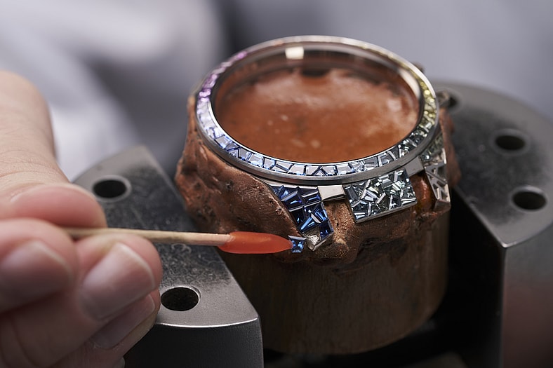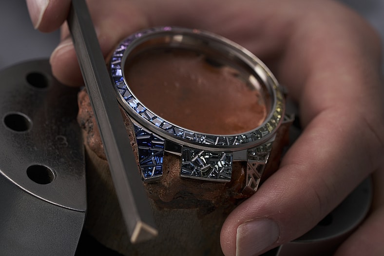 Those specs in terms of mechanics (whether visible or invisible) often include intricate details like a micro-rotor at 12 o’clock, a 6-o’clock tourbillon, and a winding and setting mechanism at 3 o’clock. The goal of the Blast series, the haute horologist notes, is “to show that it’s only by attempting the impossible that it becomes possible.” In a painstaking process for each Blast Sparkling Rainbow timepiece, a team of artisans worked across four weeks to set each of the 211 stones into various elements of the watch by hand via the “mystery setting” process. It’s a rare métier d’art technique as precise as watchmaking itself, an approach that gives the stones a floating effect.