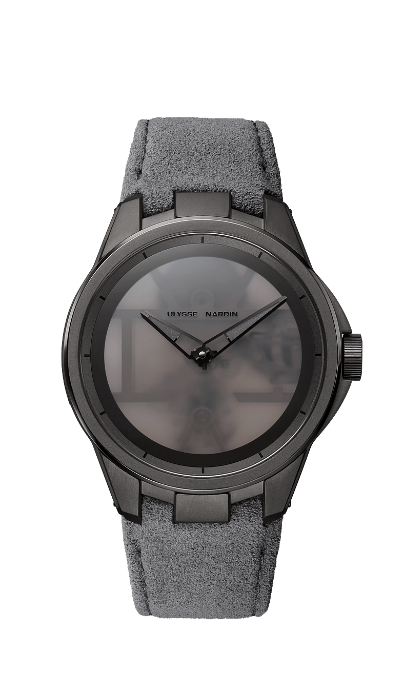 The sleek and minimalist 42mm timepiece, built with a anthracite lightweight sandblasted titanium case, is billed by the horologist as “an artistic interpretation of a horological object,” and calls back to the famed Ulyss Nardin “Freak” Watch. That particular timepiece debuted in 2001 with no dial, hands or crown, and the new Ulysse Nardin Blast [Amoureuxpeintre] is similarly minimal.