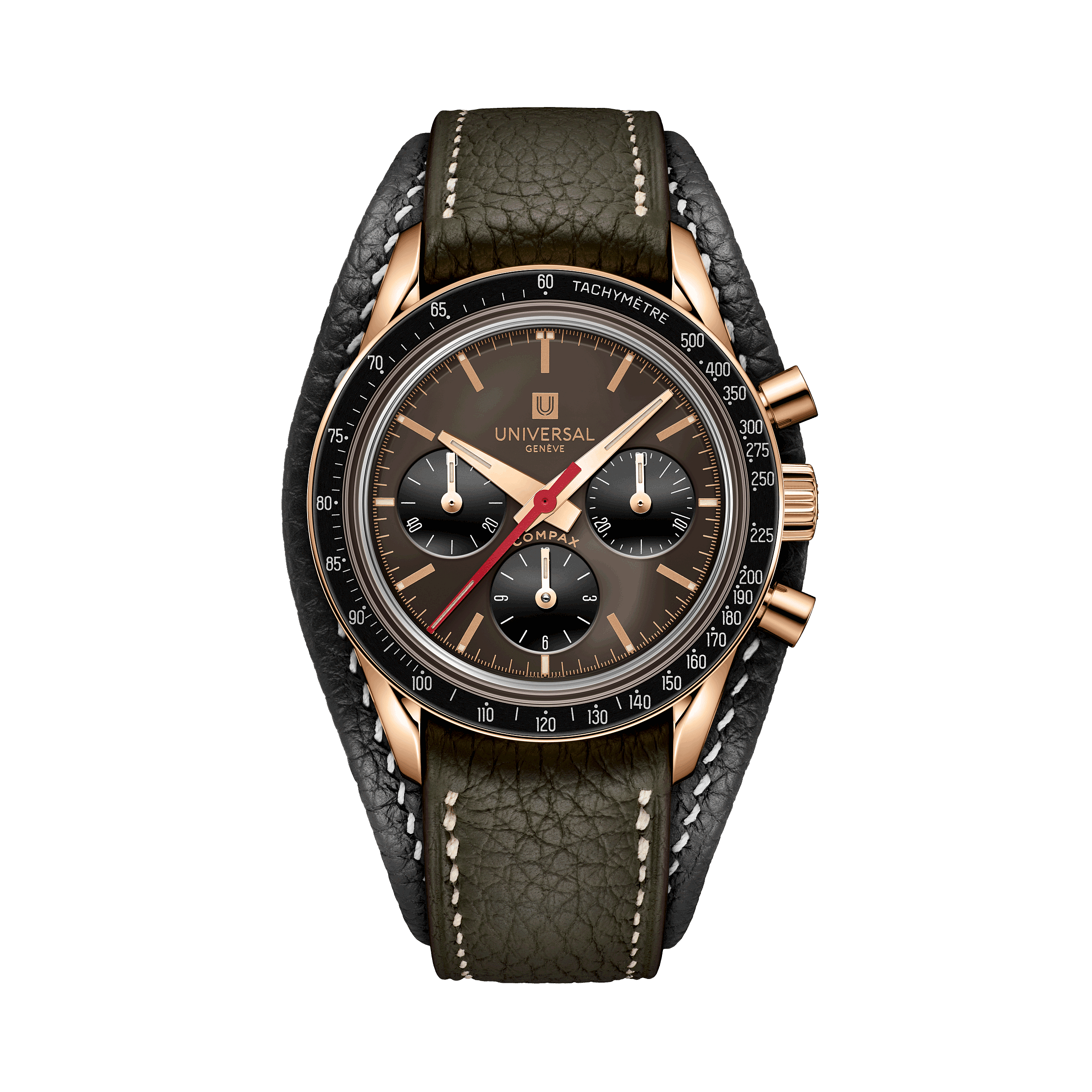 A brown or black strap pairs with the 18-karat white gold versions, while olive or taupe team with the new red gold editions of the Universal Genève ‘Nina’ Compax (which will be available exclusively upon request through the company). The milestone and the relaunch of the brand harkens back to its longtime focus on elegance fused with performance, the watchmaker said. “For us, the Tribute to Compax is a statement of where we’re going: Refined luxury shaped with the same meticulous handwork that has always defined UG,” said managing director Gregory Bruttin.