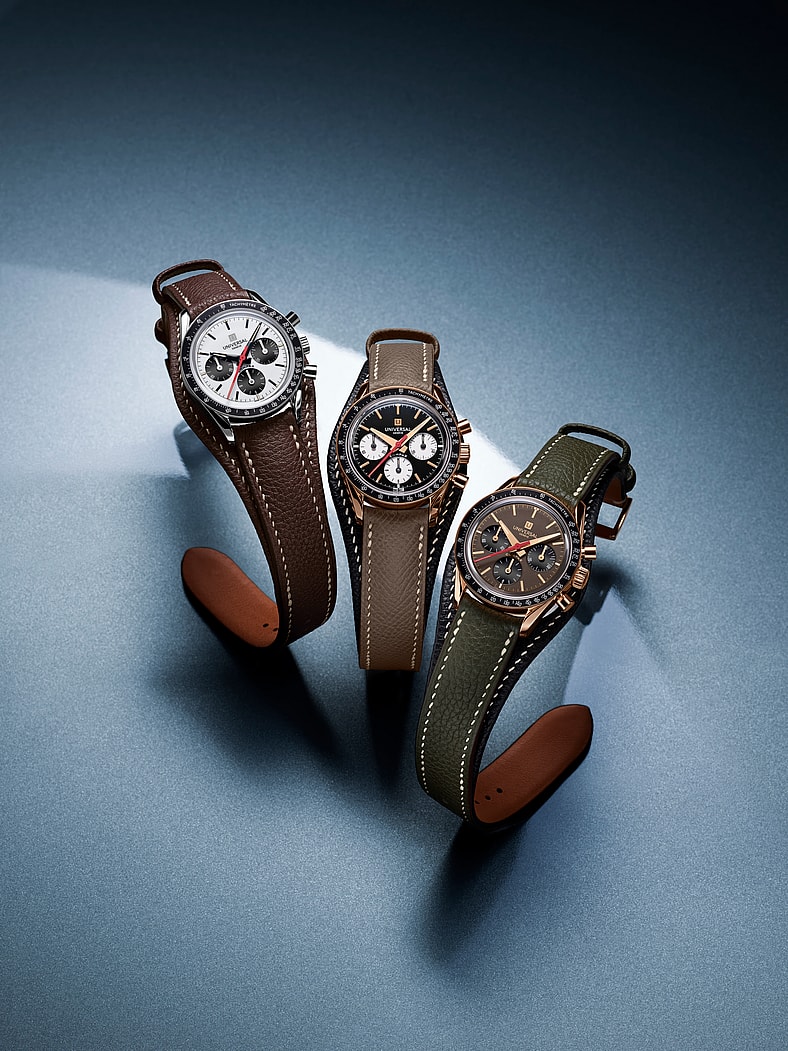 In the present day, the elegant and functional timepiece returns with chic looks aplenty in two sets of three watches, specifically in refined 18k white and red gold. The Universal caliber 281 movement powers the newly revamped set of six watches, while Japanese leather artisan Satoru Hoso worked with the company on bund-style straps with contrast stitching.