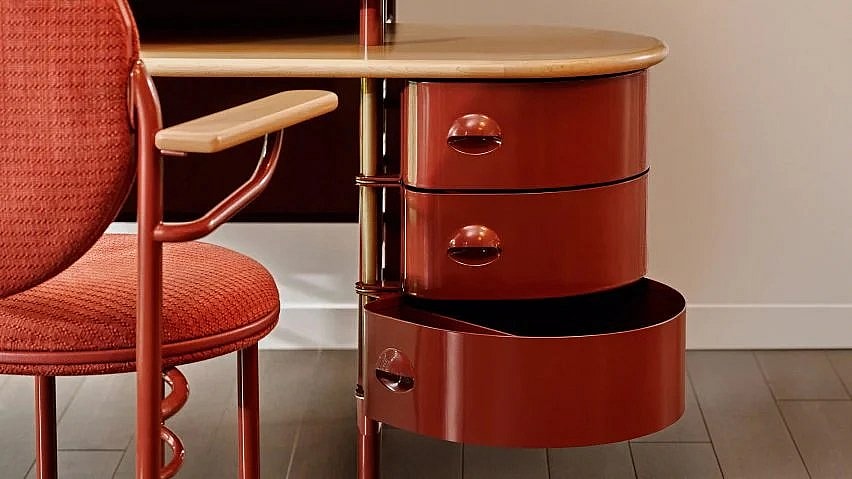 The Racine Red design in particular is visually striking and a faithful homage to the first collection of Wright’s Racine designs, while the office furniture is also available in sleek Black and Walnut hues.