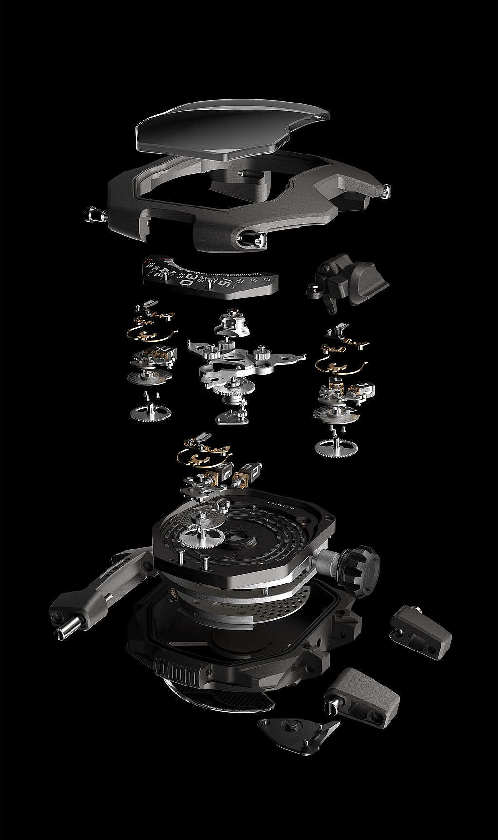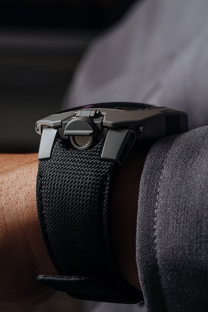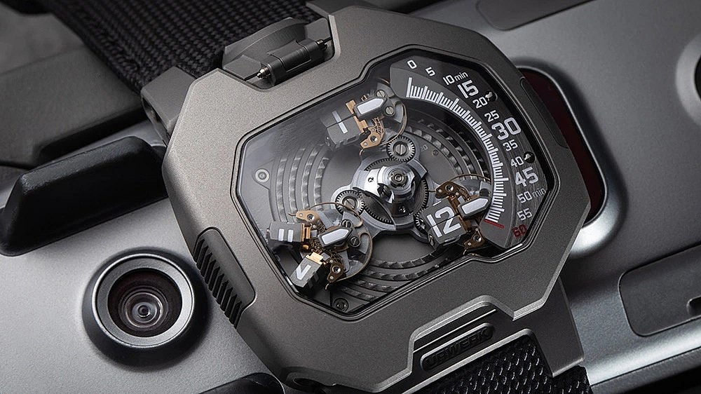 The extremely precise design, featuring the company’s UR-20.01 movement, rests within a remarkably durable sandblasted titanium and steel case that clocks in at a rather subtle 44mm (considering the overall design of the rest of the watch, that is to say).