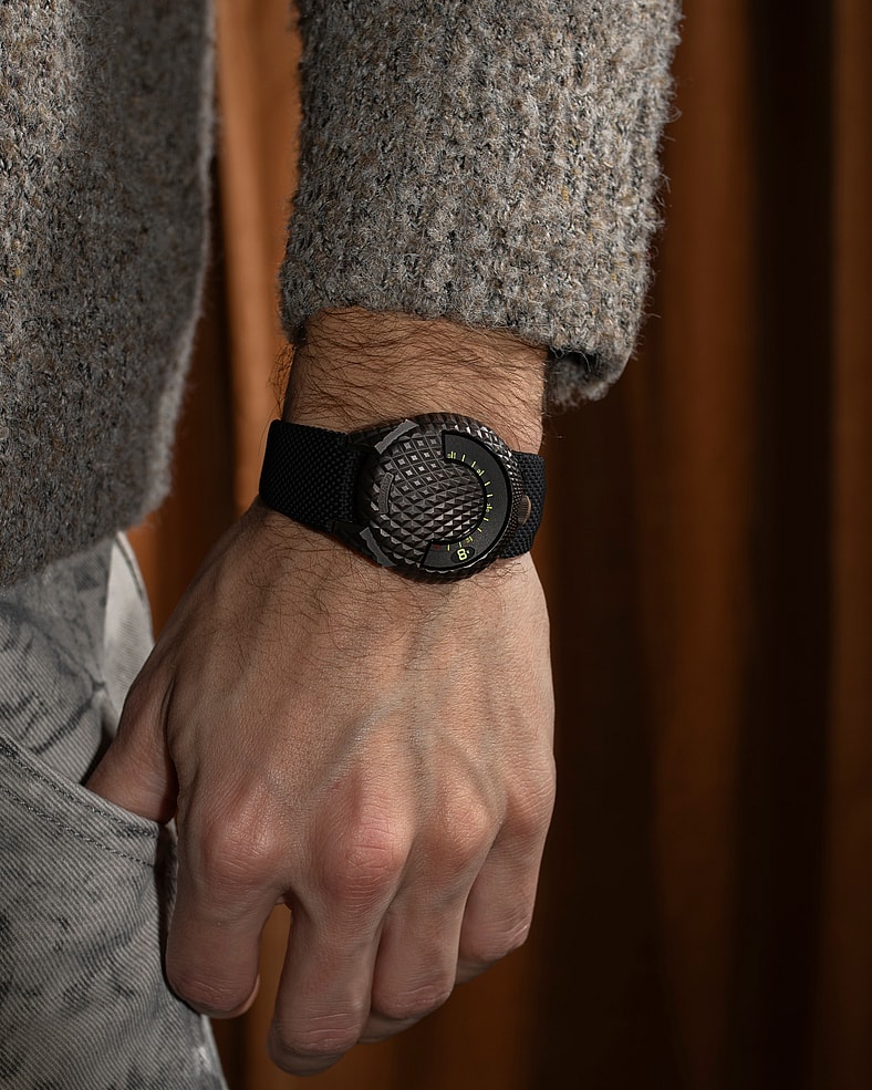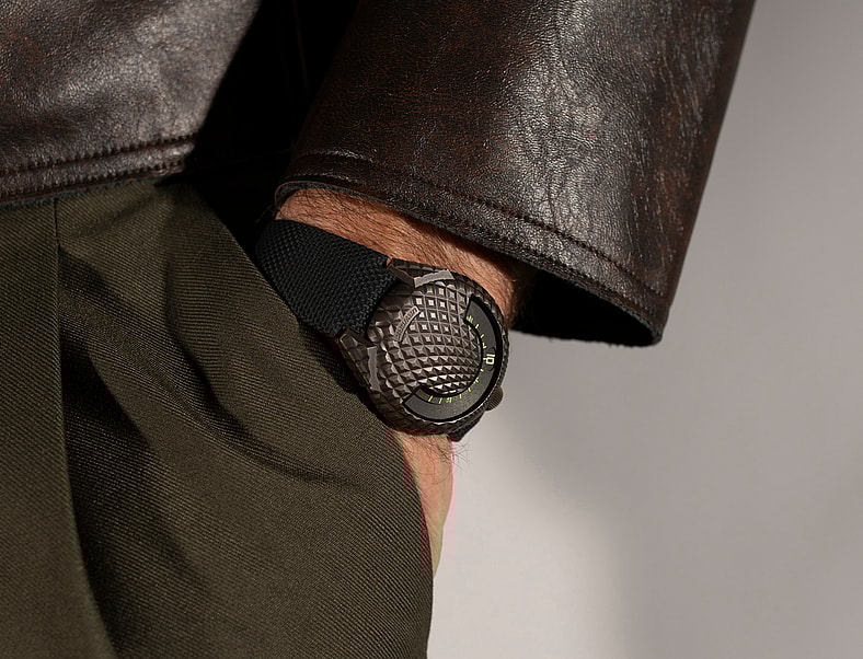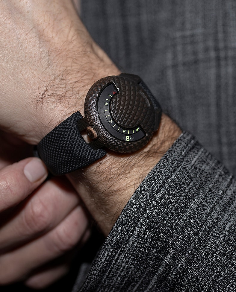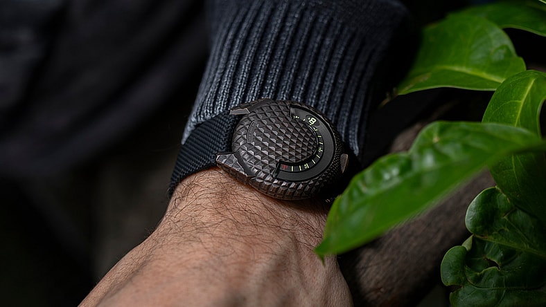 The watch is unlike any other timepiece on the market, less a watch and more a work of art. That’s certainly a compliment of the highest order considering bold wrist candy like the ceramic polar white UR-230 and the scorpion-inspired UR-250, to name but two exceptional launches from the Swiss company. Textured T-Rex like scales make up a bronze form that gets a guilloche treatment before being oxidized and brushed, a new twist on the best bronze watches on the marketplace (and one unique to Urwerk).