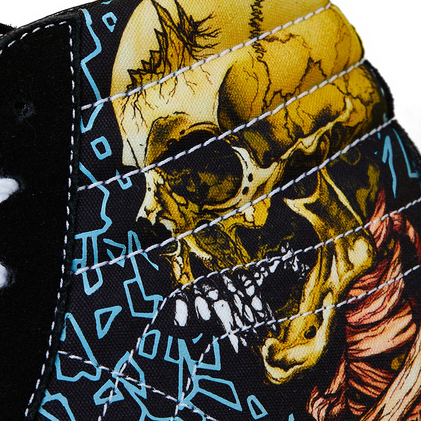 The pair of weathered skulls are featuring prominently on the the inner and outer quarter panels of the Vans Sk8-Hi. For the Vans Classic Slip-On, the skulls are split between the left and right shoes’ toeboxes.