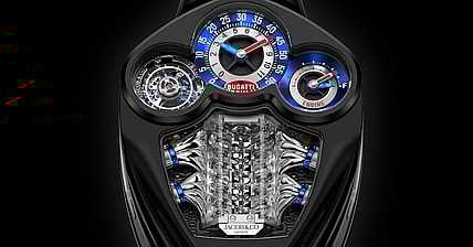 Featuring a V16 "engine" sculpted from a single piece of sapphire and a subdial "dashboard," the timepiece honors Bugatti's next-gen…
