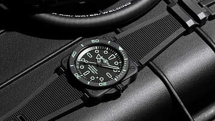 The tough-as-nails timepiece blends Bell & Ross's signature cushioned square case with green Super-Luminova tech for maximum visibility.