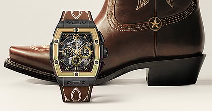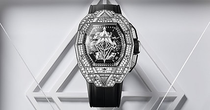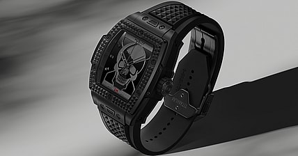 The sinister-looking Spirit of Big Bang Depeche Mode has a polished black ceramic 42mm case and a grinning skull dial.