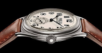 Art Deco styling, an aged steel case and an optional bund strap channel 1920s timekeeping.