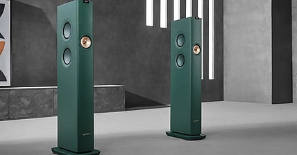 The head-turning floor speakers are inspired by supercar design and meant to be the "Bugatti of home audio."