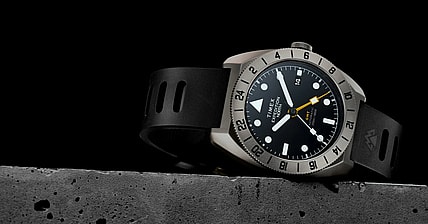 The titanium GMT's automatic movement allows for dual time zone tracking thanks to a bright yellow fourth hand.