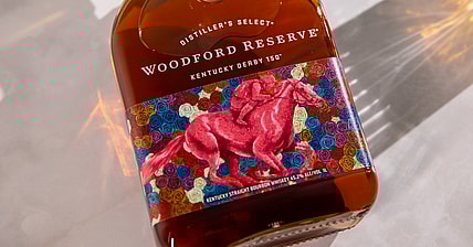 A thoroughbred horse races through roses on the label of Woodford Reserve's latest collectible bottle.