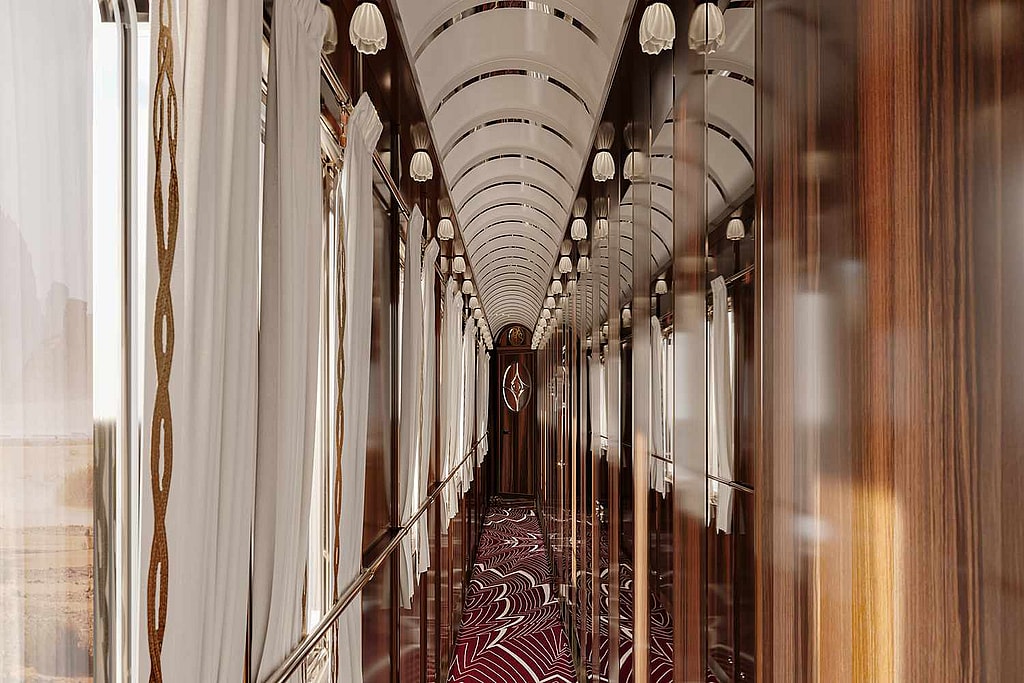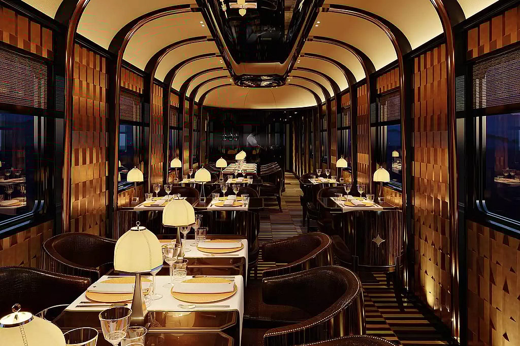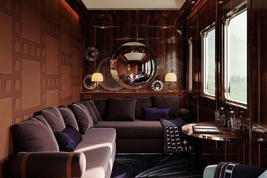 A first look at the Orient Express reveals opulent quarters and carefully considered details throughout, with a rich color palette, details like glass-domed roofs and scalloped banquets, and a focus on the Art Deco throughout.