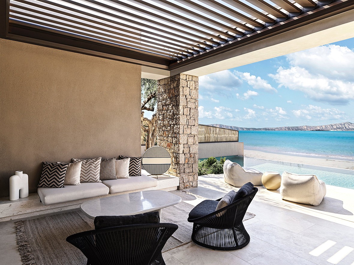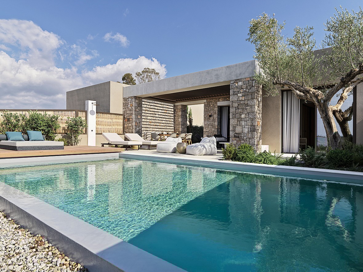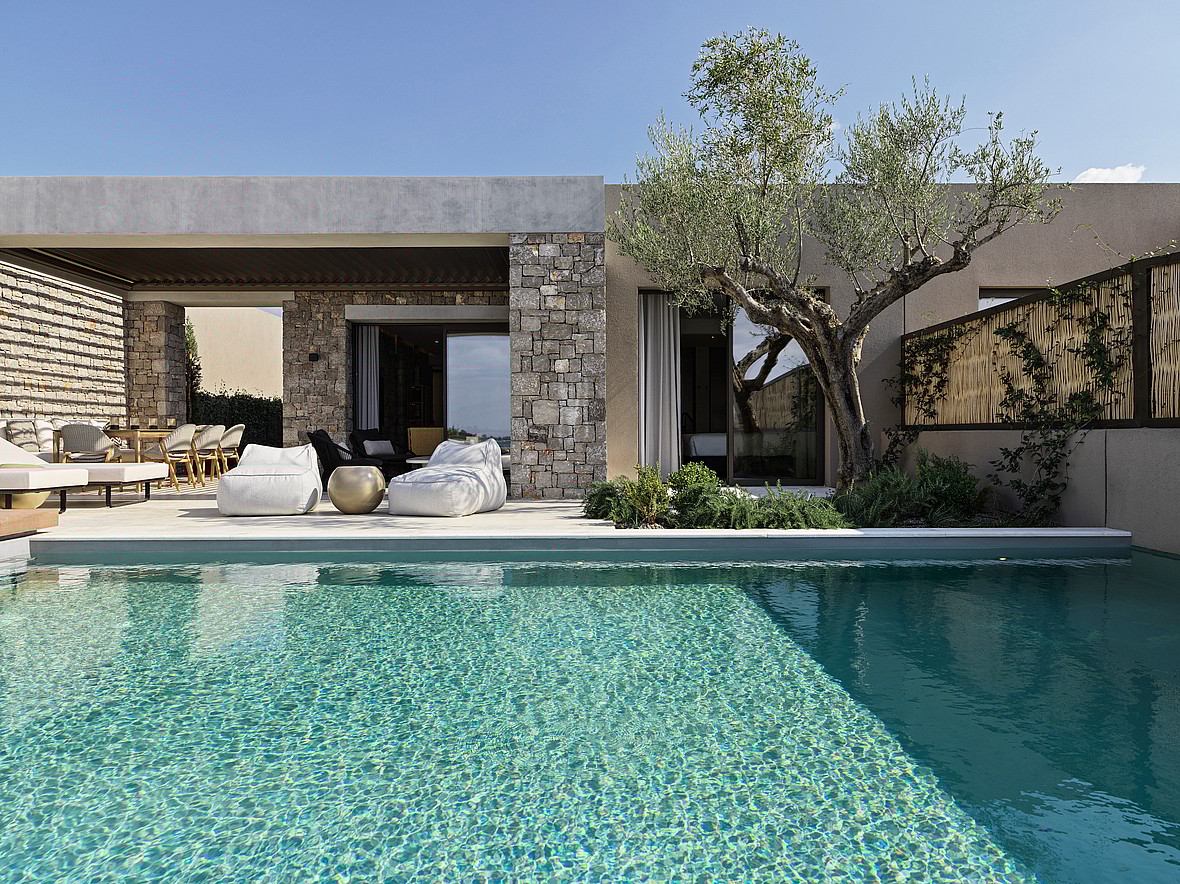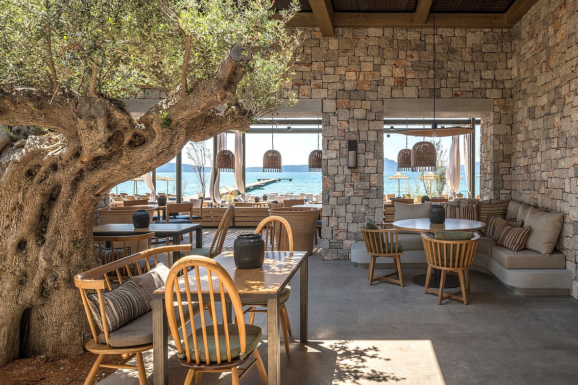 Olive groves, some with trees that are hundreds of years old, are interspersed with stone and wood structures, some with planted roofs, designed to evoke both a traditional Greek coastal village and a more contemporary beachside aesthetic, which harmoniously blends into the picture-perfect landscape and emphasizes the ocean views.