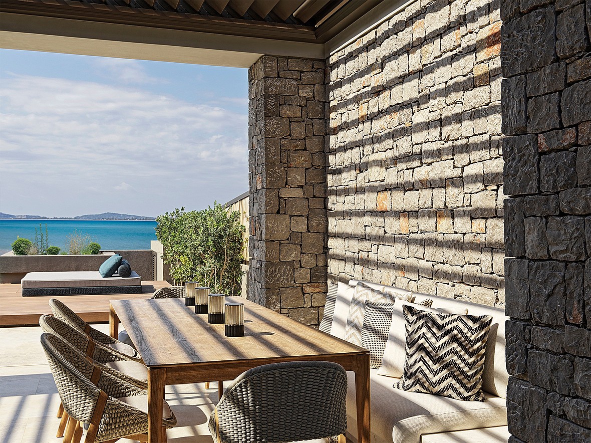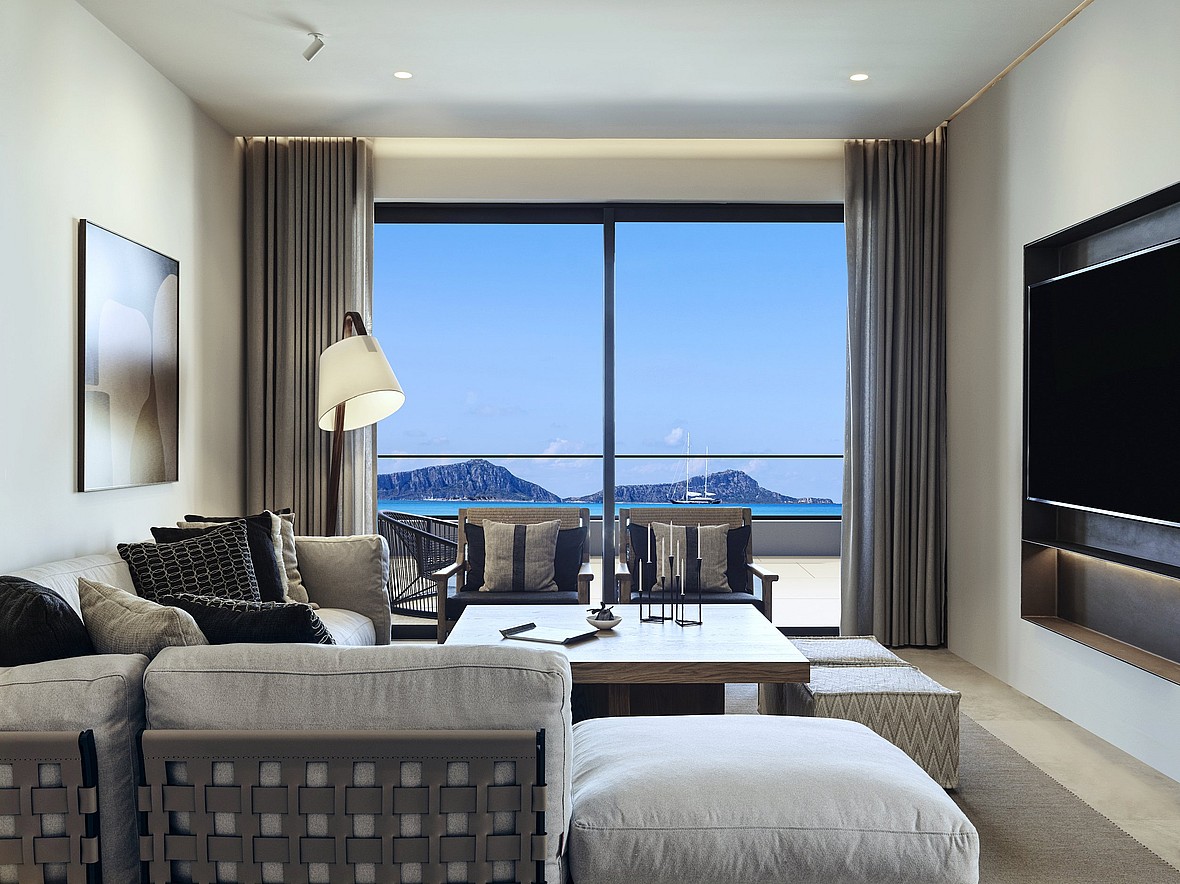 All guestroom, suite and villa interiors are designed to “celebrate the heritage of Greek artisans with a palette of neutral tones [and] occasional with pops of color,” along with “modern yet refined interpretations of traditional craftsmanship,” can be seen in the lighting, flooring,” numerous referenced to time-honored Greek basket weavers, and even leather chairs that “offer a contemporary interpretation of regional saddle-makers’ art.”
