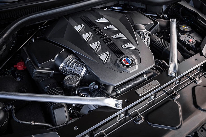 The XB7’s Alpina-tuned 4.4-liter V-8 Bi-Turbo engine delivers 631 horsepower and 590 lb-ft of torque, accelerating from 0-60 mph in 4.1 seconds with a 180 mph top speed. It features BMW’s 48-volt mild-hybrid system paired with an 8-speed Sport Automatic transmission and all-wheel drive. Signature Alpina design elements distinguish it from standard X7 models: unique front apron with enlarged air intakes, split LED headlights with Swarovski crystals, illuminated kidney grille, and four distinctive oval exhaust pipes.