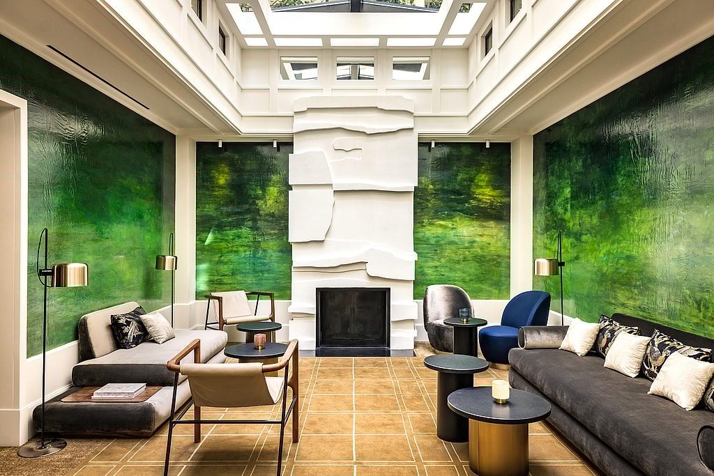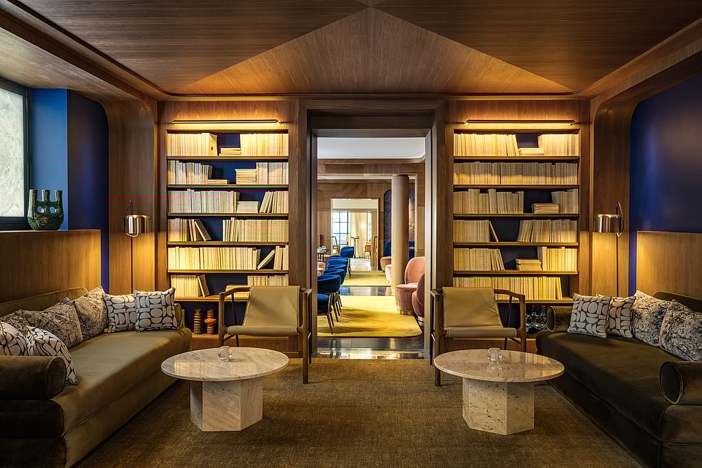 At the center of the hotel is a book-filled Library, which acts as a passage to the various communal areas, with “cosy nooks offering a secluded space for reading, relaxation and quiet contemplation.” Here the walls and ceilings are wood paneled, thick rugs muffle footsteps,” and the bookshelves are lined with immaculate copies of [famed French publisher Gallimard’s editions.