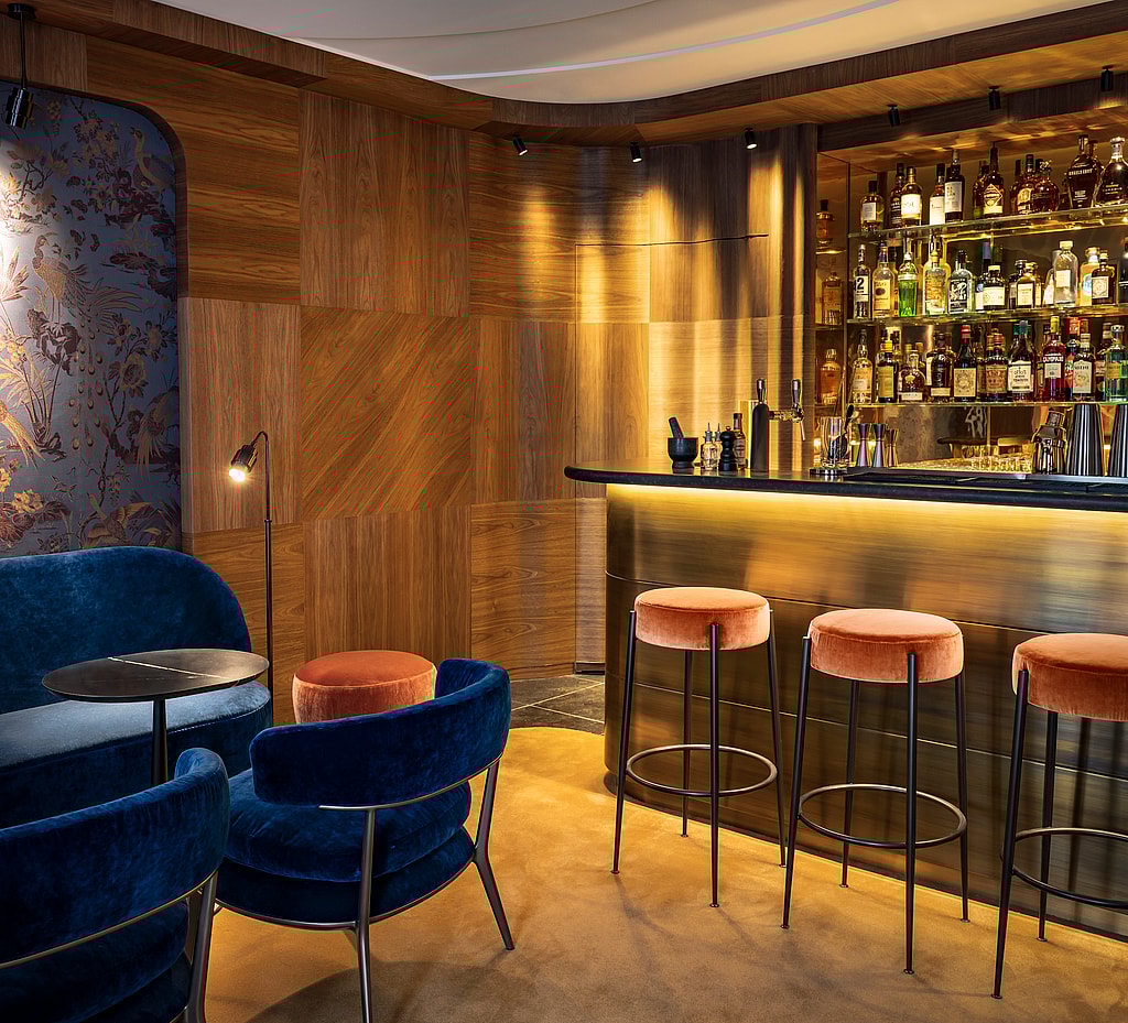 At the new restaurant, curved seating and banquettes combine with wooden accents to provide a “warm and intimate feel,” with leather and velvet benches, quartzite tables and expansive mirrors that “reflect the liquid gold of the lacquered canvases adorning the walls.” At the bar, named after James Joyce, there are tones of midnight blue and powder pink velvet offset by rich wood and embroidered Oriental wall panels.