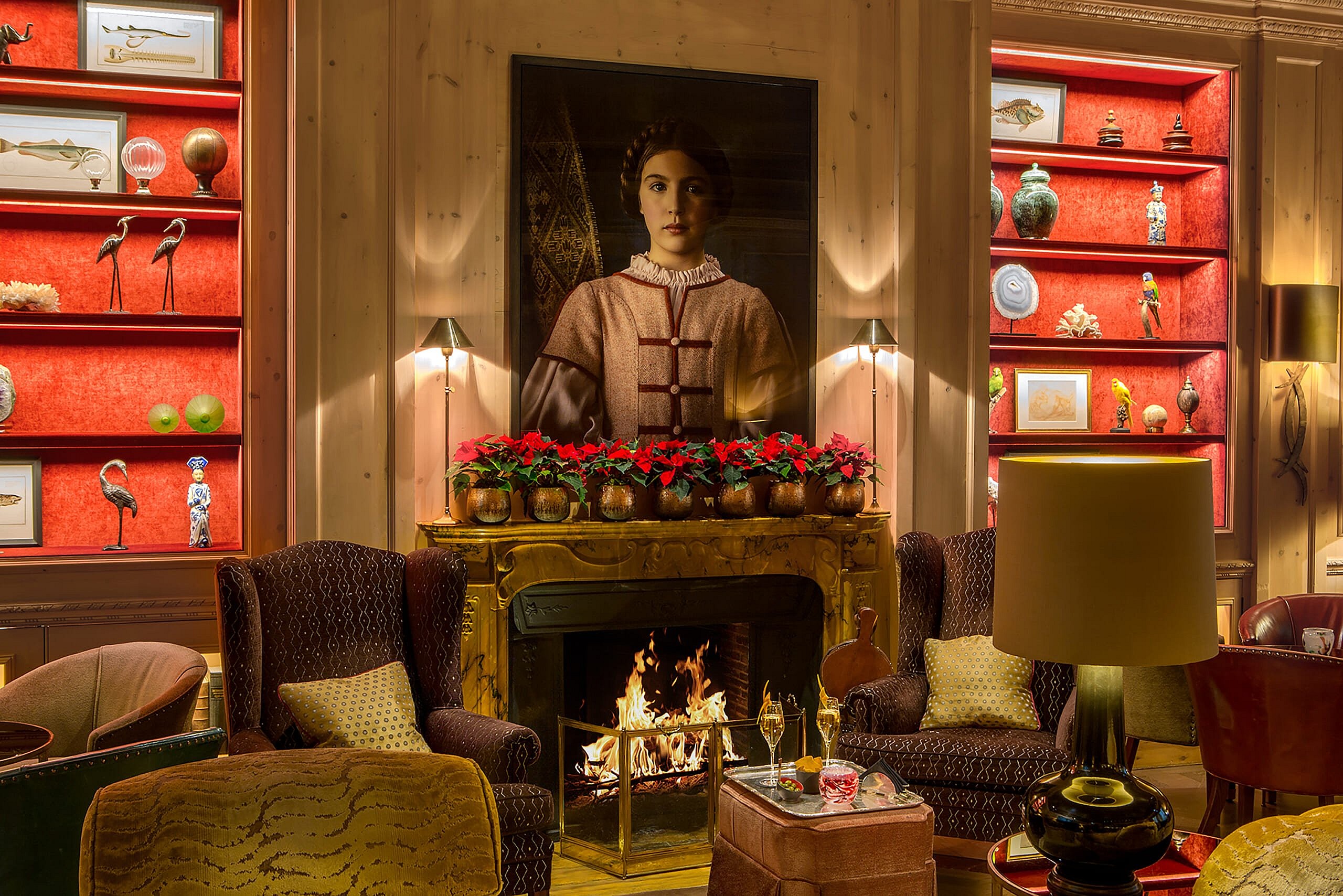 On the walls you’ll find a “cabinet of curiosities where shelves, designed like jewel boxes, reveal a private collection of rare spirits, vintage books, botanical prints, seashells and contemporary sculptures”; while above the wood and gold-granite bar, a monumental mirror transforms into a screen each night to display the videos of cutting-edge contemporary artists.