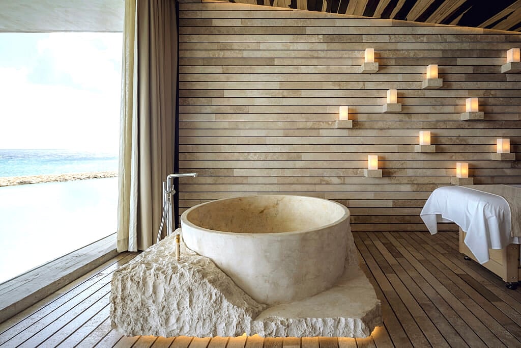 It offers 13 spa treatment cabins, two salt rooms, two mudrooms, hydrotherapy rituals, sauna, steam and cold rooms, relaxation areas, and an Alchemist’s Studio where guests can create their own scents. And the carved stone tubs, which you can also find versions of on the private deck of your suite, are works of art.