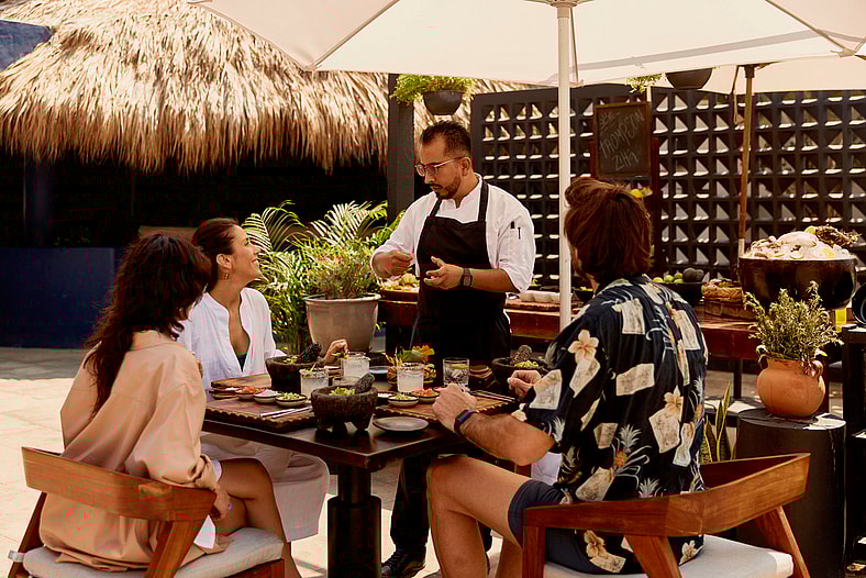 “Part of the inspiration of this menu, with the concept of cooking with fire and smoke, is to make Ceniza a restaurant with very Mexican touches. So all of the plates use technique from the Mexican kitchen,” Executive Chef Omar Barquera tells me as he serves up a black clay bowl popping with a bright orange mole. The climax plate of the seven-course tasting centers around a perfectly roasted seabass filet, oven baked over mesquite until edges are thinly crisp, yet succulently juicy within. Around it pools a fiery orange mole made of squash seeds, with crisp watercress and freshly rolled tortillas alongside. Located in a round thatched-roof palapa, the Thompson Zihuatanejo hotel’s signature restaurant features a clean, minimal design with polished concrete floors and crafted wood furniture.