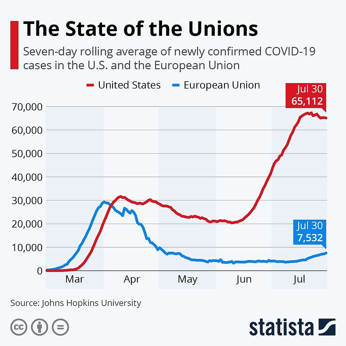 [As the] chart, based on data from Johns Hopkins University, illustrates, the trend of daily new COVID-19 cases has taken completely different trajectories for the U.S. and the European Union. While cases in the U.S. started surging in mid-June, the outbreak appeared to be under control in the EU.