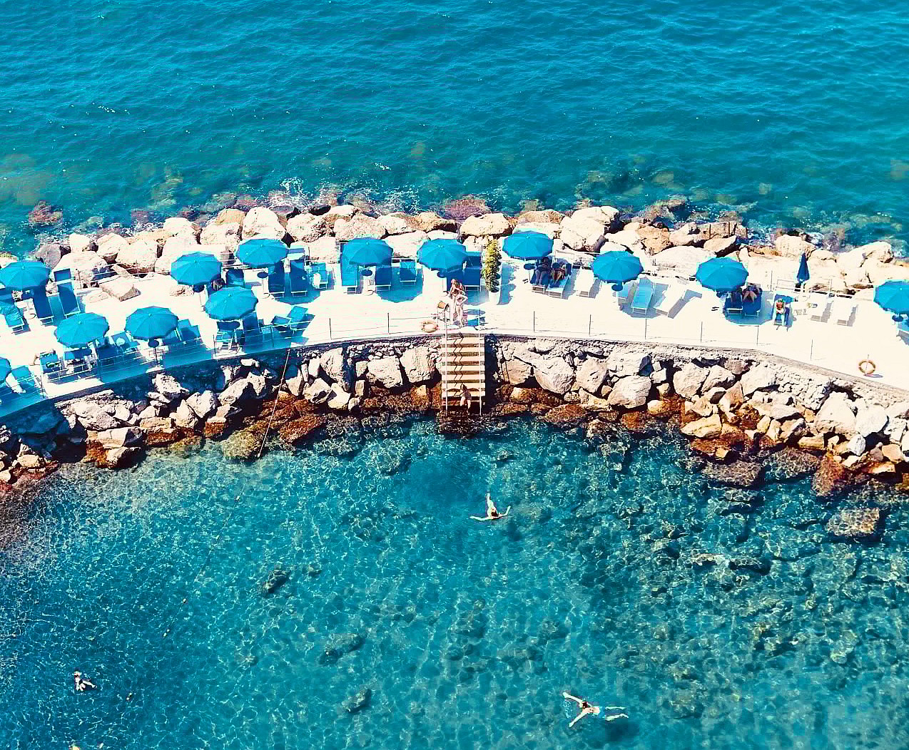 The hotel is surrounded by extensive, lush gardens, including several rare botanical specimens that date to the earlier beginnings of the property, and there is a salt water pool designed by Ponti that echoes the angular forms he liked so much. A path through tunnels in the rock leads from the hotel to the private beach-sunbathing area suspended over the sea on a boulder-strewn jetty. During the summer, the beach deck is home to the al fresco Poggio Siracusa restaurant as well.