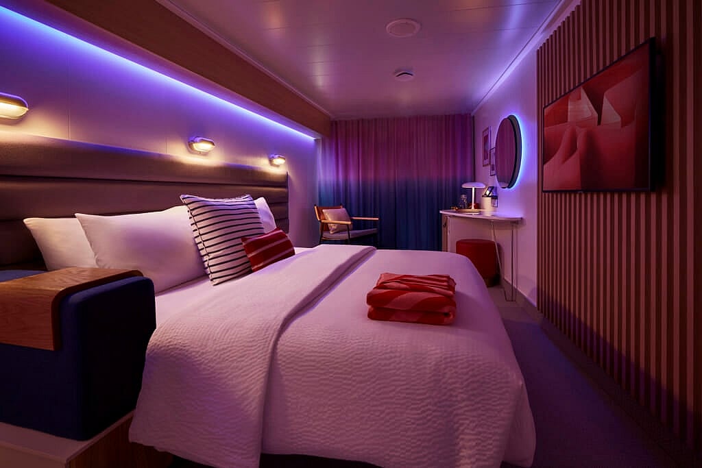 “The cabin was created to be our Sailors’ retreat. Over 93 percent of our cabins offer sea views and the chance to hang out and watch the waves. Inspired by Virgin Group’s signature lighting across the airlines, we knew how important lighting was to create the best ambience. Our cabins feature five different lighting settings to reflect the different moods of the day. The lighting evolves from relaxing during the daytime to “Let’s Get It On” if you really want a moody evening.