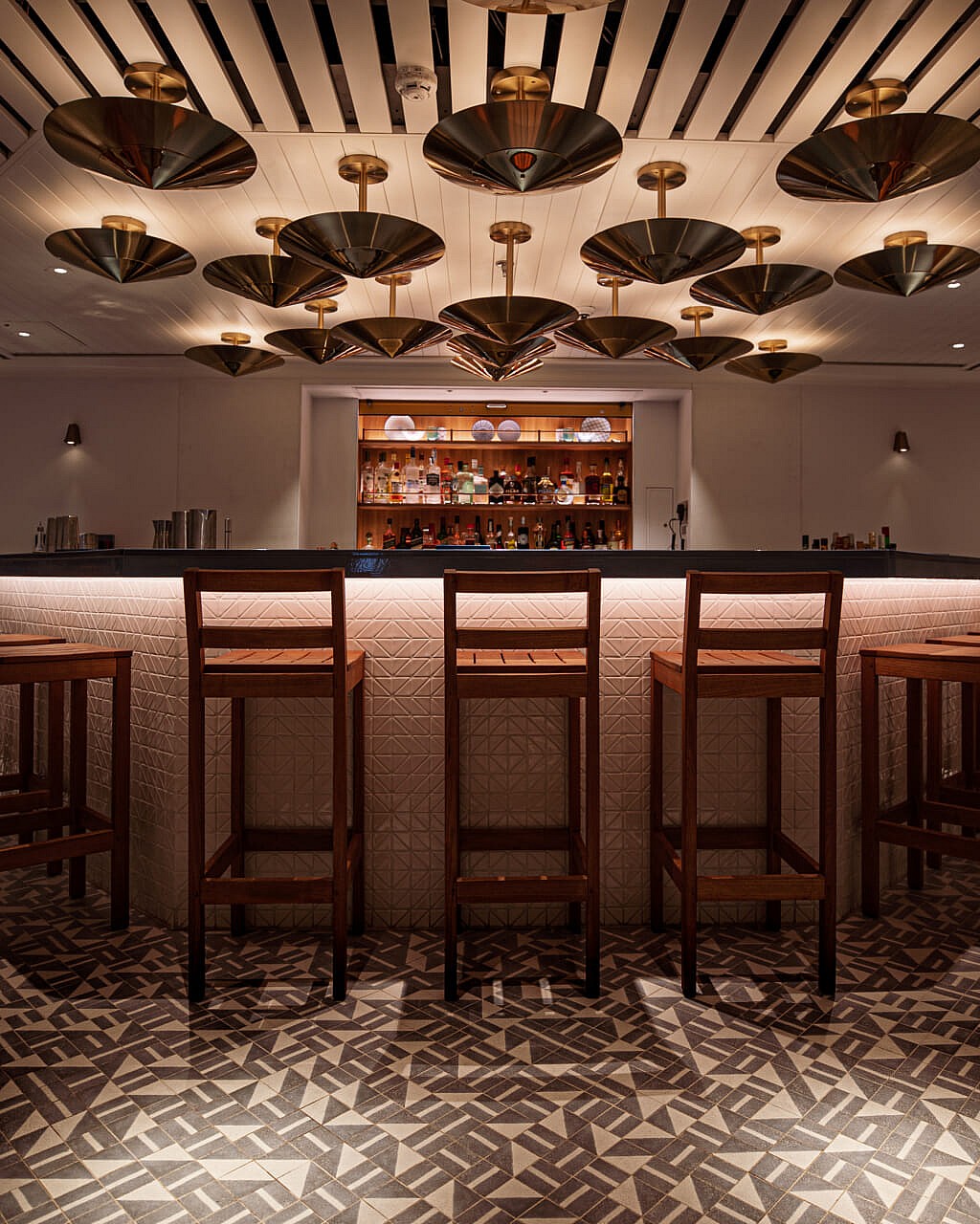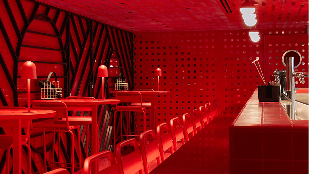 “We had great fun creating Razzle Dazzle, an eatery with a vegetable-forward menu. The design is based on the graffiti ships of the first World War, when black-and-white striped patterns confused the enemy in knowing what direction the boat was traveling. Our architects, Concrete Amsterdam, used these crazy patterns as the backdrop for this premium restaurant.