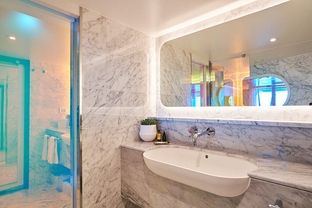 “For Virgin Voyages, it’s all about the sea views. The beds are the hero of the suite, positioned at an angle to maximize the ocean view. The RockStar bathroom sits behind, and the angled configuration allows us to create an ultra large walk-in shower. It even has a peek-a-boo window so the Sailors can look out at the ocean beyond and watch the waves roll past.