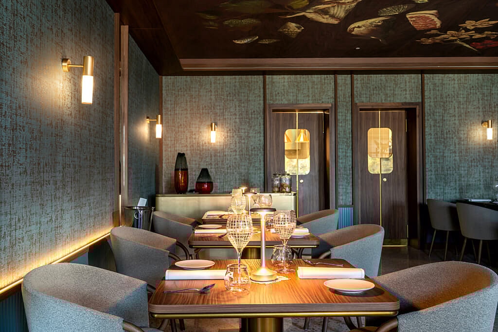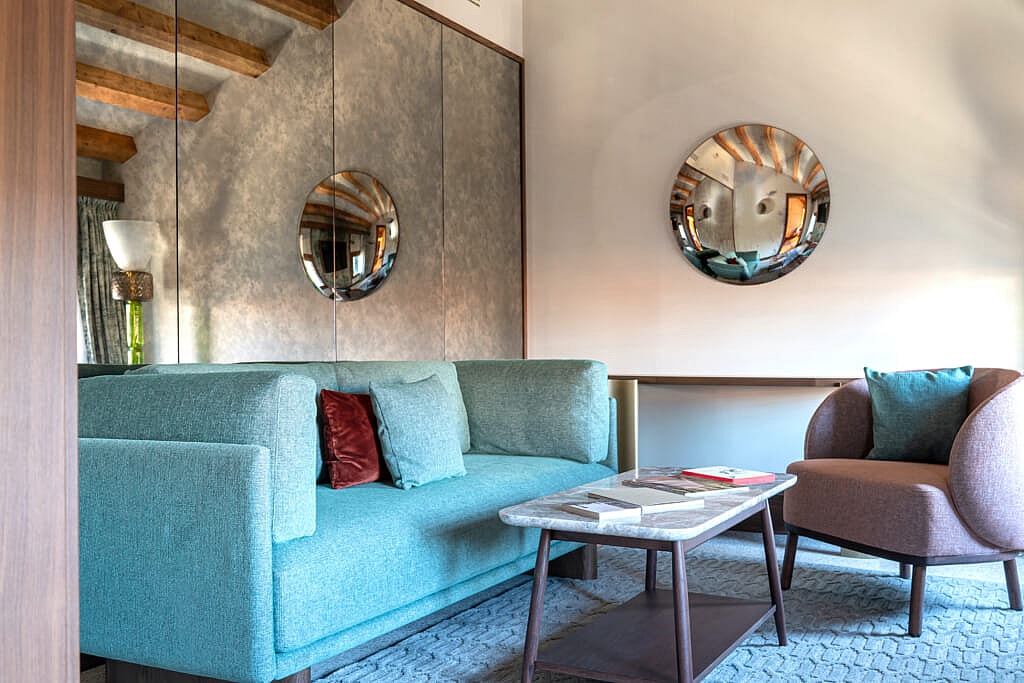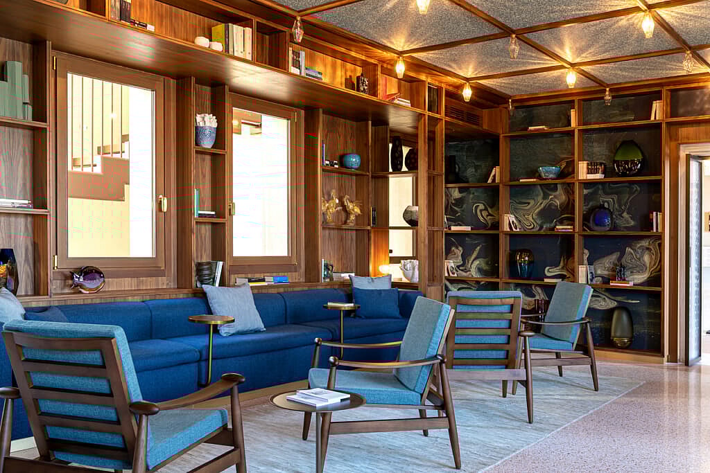 The lobby was created from the historic church that once occupied the center of the site, and is illuminated by a chandelier made of over 14,000 Murano glass crystals—created entirely by hand according to the city’s legendary glassmaking tradition, and “designed to reproduce three sails that reflect the shape and sinuous movement of the seating below.”