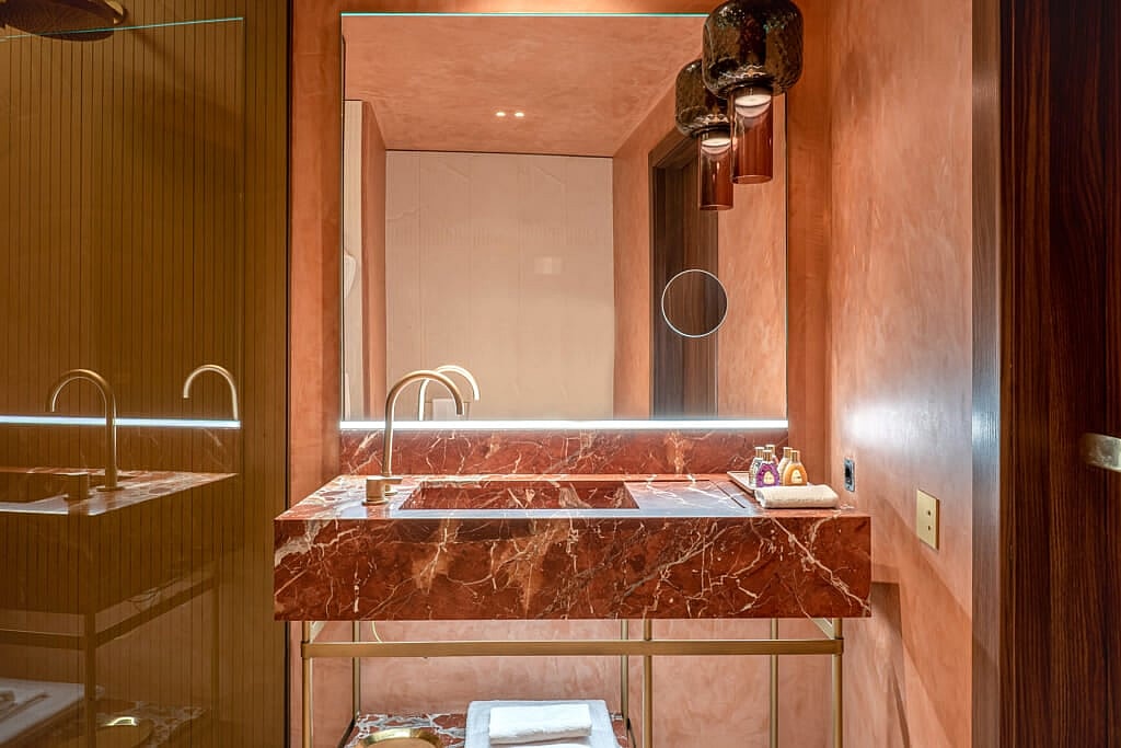 The hotel’s upper floors are home to 57 suites and nine Deluxe rooms, carrying over the design concepts of the public spaces, but in a more intimate manner. There’s an emphasis on “continuity and relevance” to the windows onto the city, and the relationship between the rooms and their surroundings.