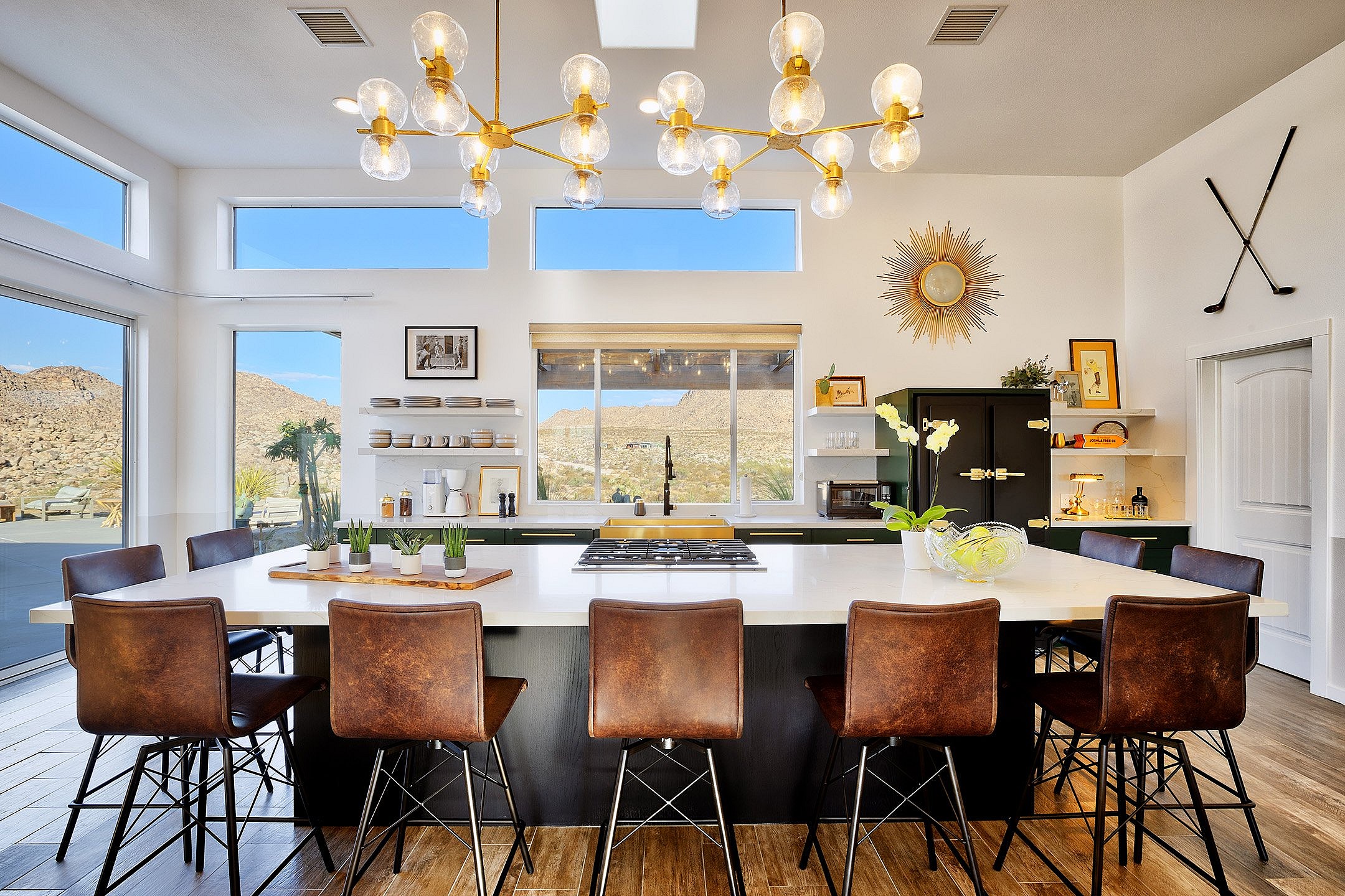 Overlooking the sweeping mountains from the floor-to-ceiling windows, the kitchen is our favorite room, and opens onto the living area and the pool deck. “Joshua Tree Country Club is the ultimate desert oasis, ideal for large families or groups of friends with a penchant for the unusual or curious explorers looking for exceptional opulence amidst nature’s sand-filled bounty,” Brookelyn Fox tells us.