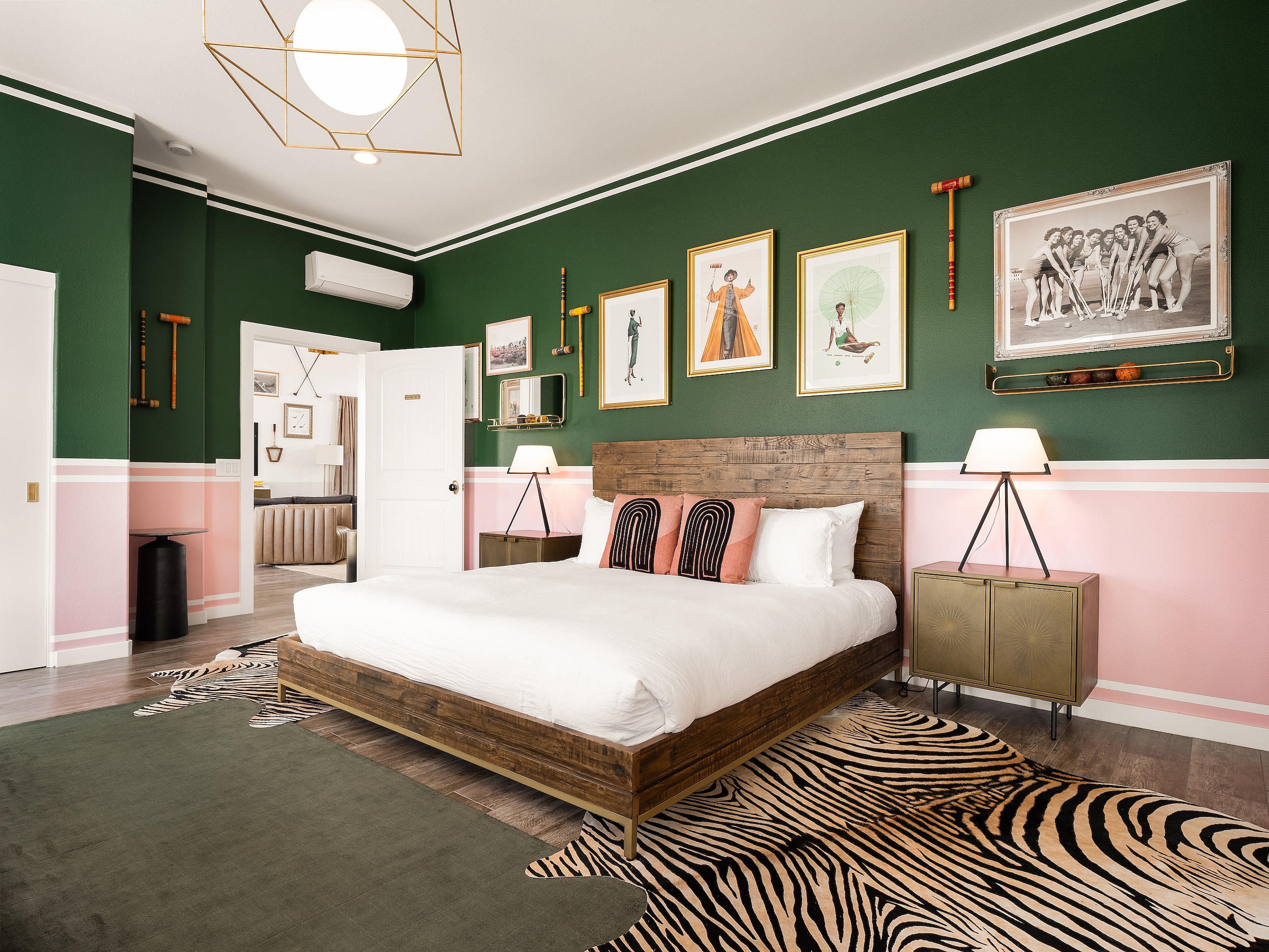 Sleeping up to eight guests, the property’s three Suites are each inspired by a country-club sport (Tennis Suite, Croquet Suite, and Pool Suite aka the master bedroom), and utilize sustainable mattresses by Nest Bedding draped in soft linens by Matouk. With shades of forest green, navy and pink painted throughout by artist Michaela Kary, they abound in quirky design elements—from a headboard made from tennis rackets to sets of croquet mallets and balls hung on the walls.