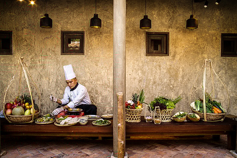 “Waking up in the morning to a swim in that pool,” a fellow scribe mumbles to me a couple hours later as she chopsticks a dumpling at breakfast, “is like a kiss to my soul.” Couldn’t have said it better myself. As with all mornings at the Zannier Bãi San Hô, we follow our skinny-dip by kicking the day off at the mountaintop Nhà O restaurant with a steaming bowl of pho—the famed bone-broth soup normally reserved for dinner in America. On the terrace overlooking the resort’s vast property, we stir the sliced beef, heaping with fragrant lemongrass and freshly cut green onion, the potent red chilies waking the body for the day’s activities.