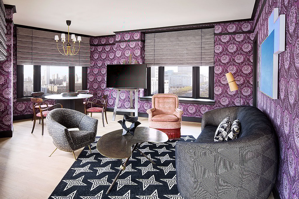 The 131 rooms and suites designed by Wearstler are topped by a one bedroom, apartment-like suite, with a layout that “separates moods and modes of living and entertaining,” and furnished with a captivating mixture of vintage and contemporary furniture, lighting and rugs, set off by killer city views.