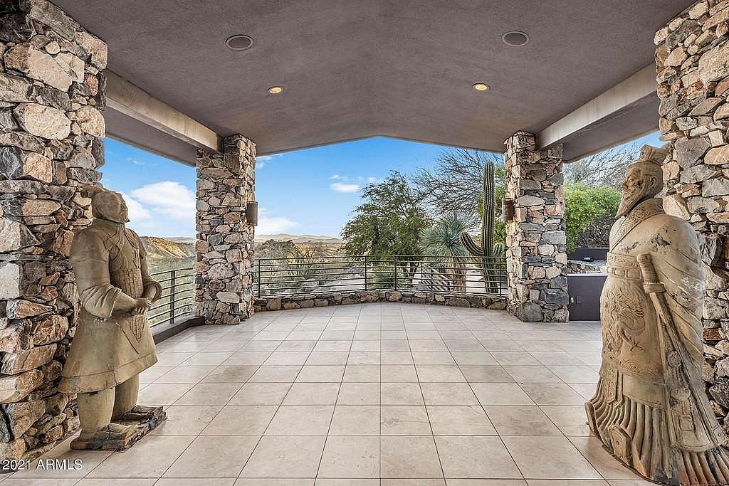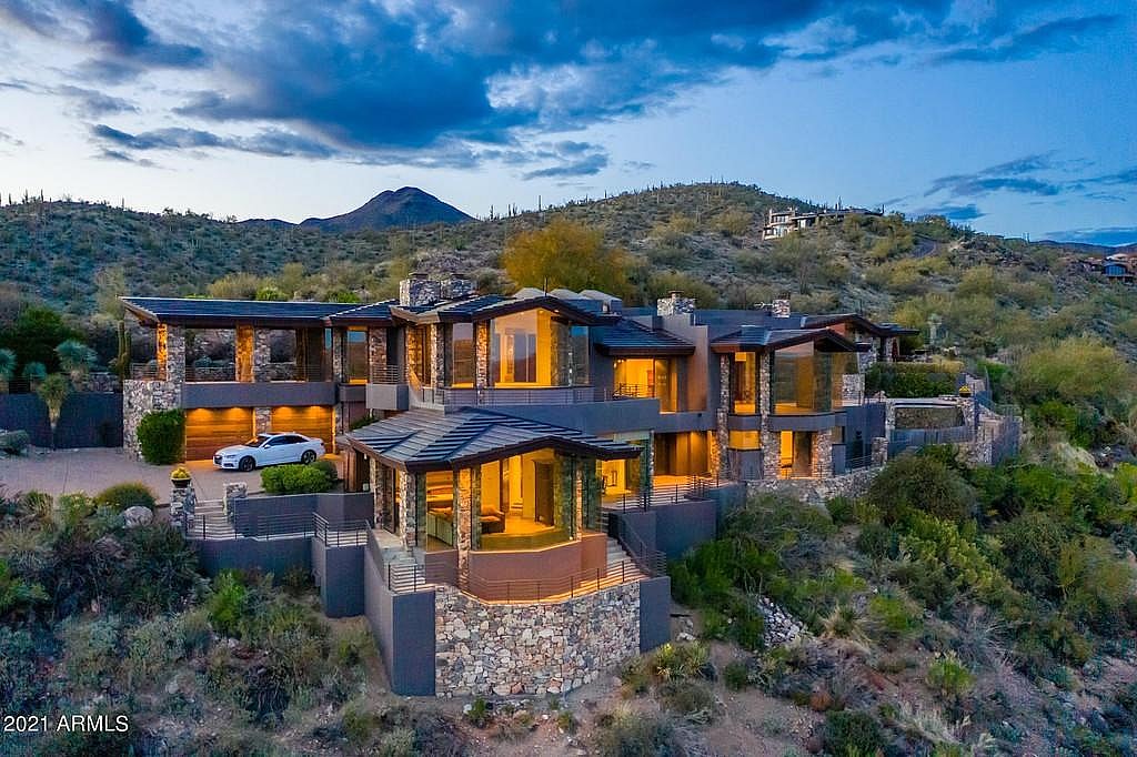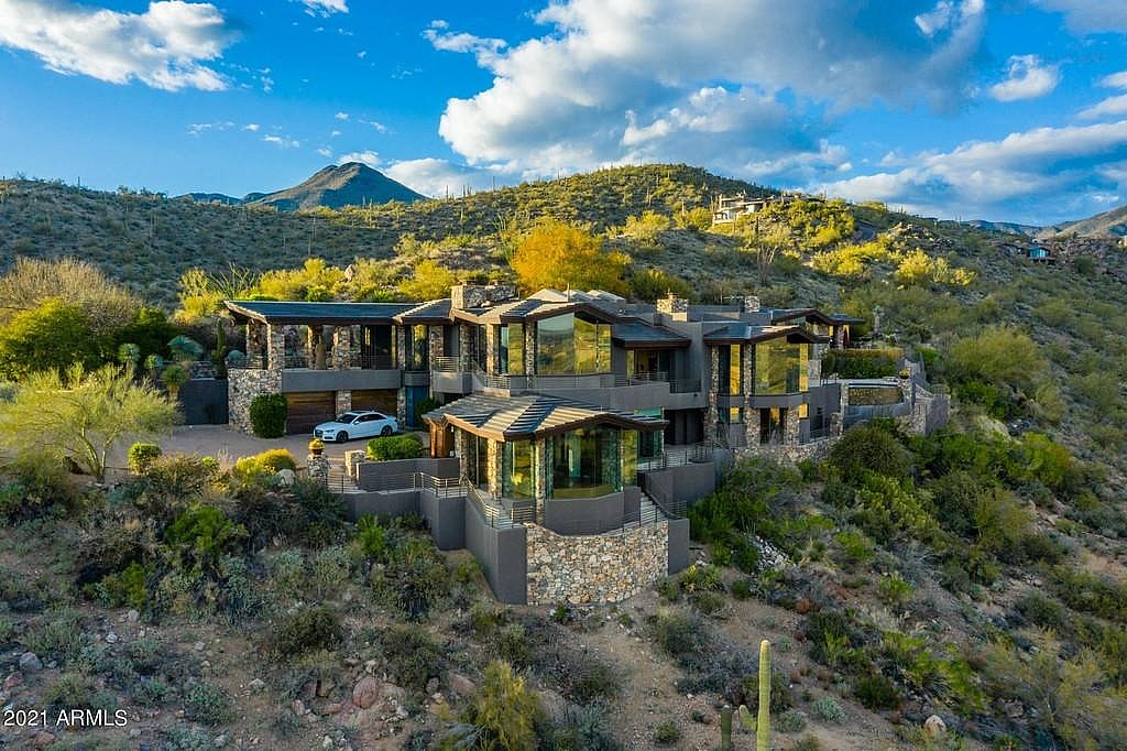 Built into a scenic hillside overlooking the Phoenix metro, the sprawling 5-bedroom, 5.5-bath estate resides on 12 acres at 3,000 feet above sea level in tony Scottsdale, Arizona.