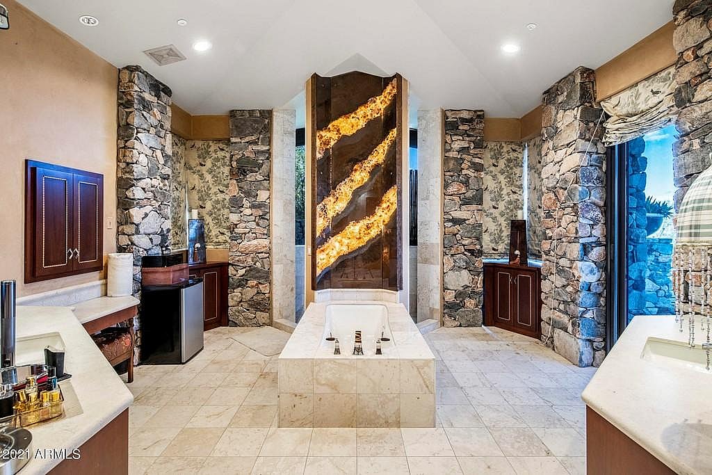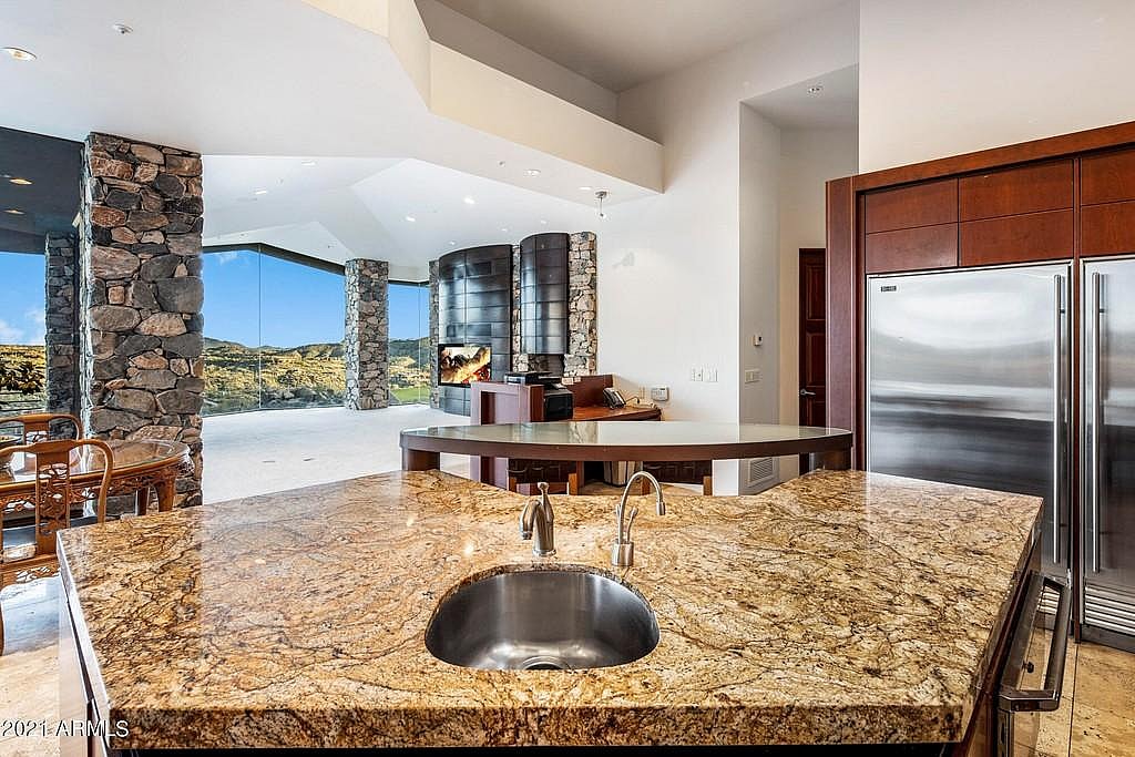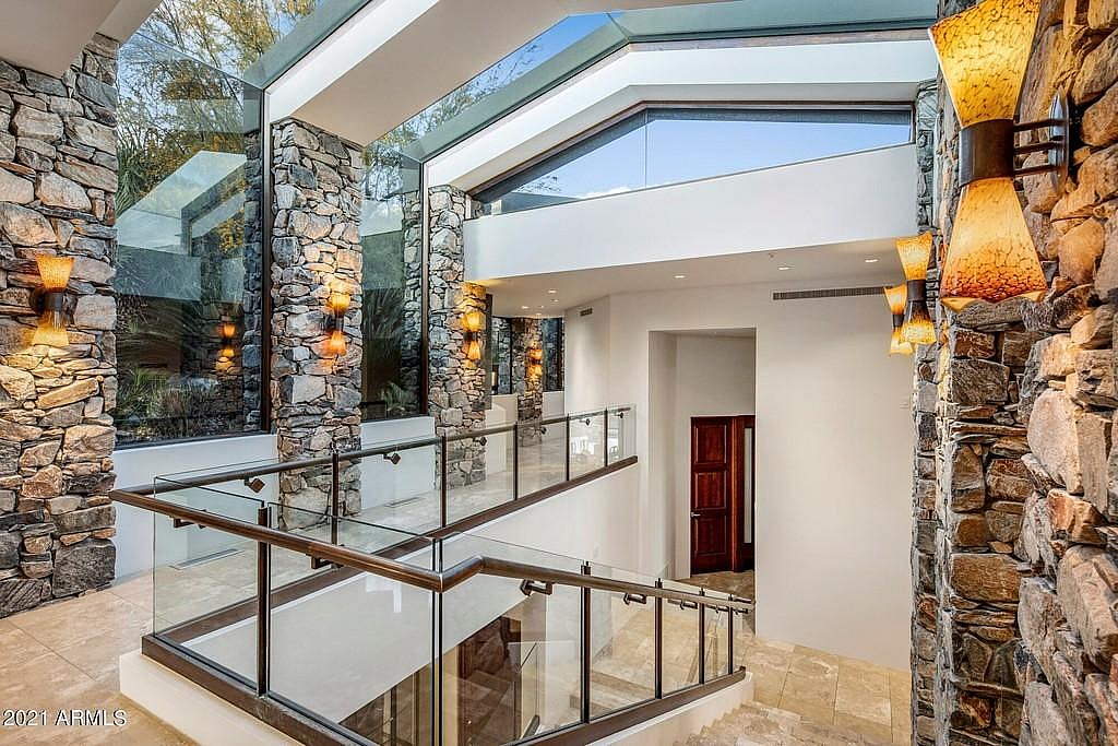 The exterior is accented with natural stone, bulletproof floor-to-ceiling glass, and natural copper, with a maze of meandering patios and balconies that provide multi-directional scenes of the cacti-populated desert.