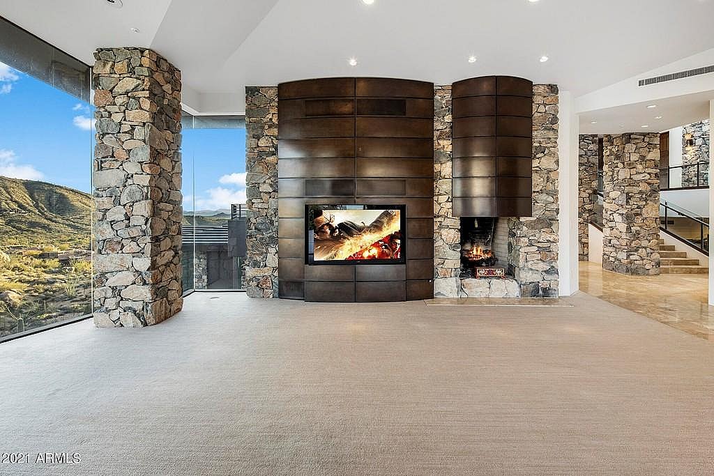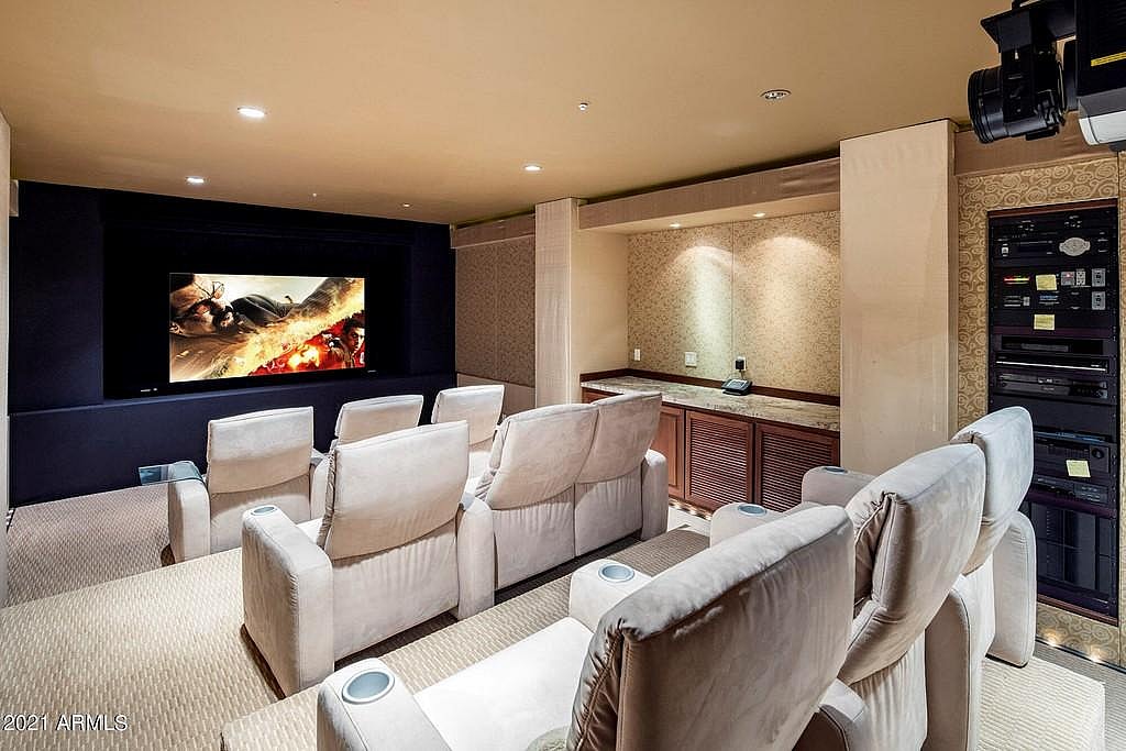 Inside is an open “Desert Contemporary”-style interior with four bedrooms, a home theater and several “flex” (multipurpose) rooms. A fifth bedroom, full kitchen, and living room are located on the mansion’s guest home.