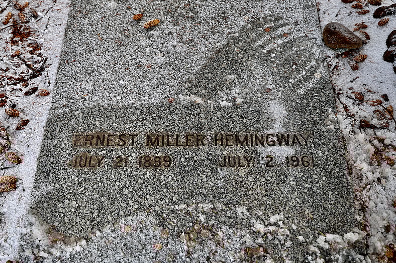 Snow was falling on the Ketchum Cemetery, muting our footsteps and giving our mission a sense of something holy. I was there to find Ernest Hemingway’s final resting place, but all the stones were flat and covered with snow. Finding his headstone, I realized, could take hours. So, I appealed to my intuition. I had once seen a picture of his and Mary Welsh Hemingway’s gravesites, so I knew they were near trees. I gave up on the idea of a trial-and-error search and just walked over to where I felt the stones would be, wiped away the snow and there was his name.