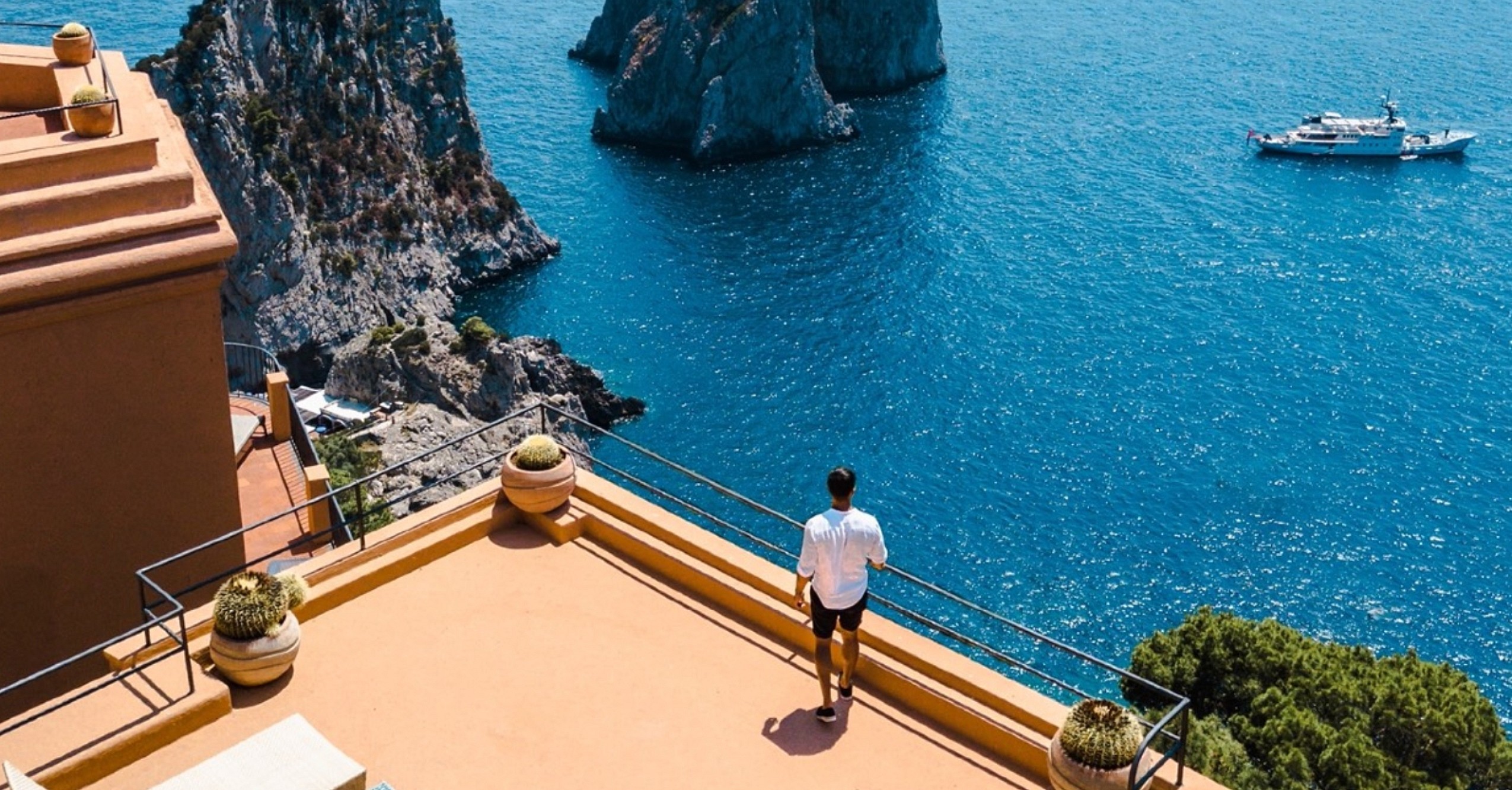 Following the most recent renovations in 2022, the gorgeous hotel is more than ever “an elegant retreat, full of charisma and character,” as Manfredi puts it. The suites are like miniature museums, blending traditional materials like marble, plaster and stone with contemporary design flair. The 5th-floor Art Suite at 700 sq. ft. has incredible views over the Faraglioni rocks from its enormous terrace. Of especial interest is the eye-popping master bath room with its soaking tub seemingly suspended over the sea.
