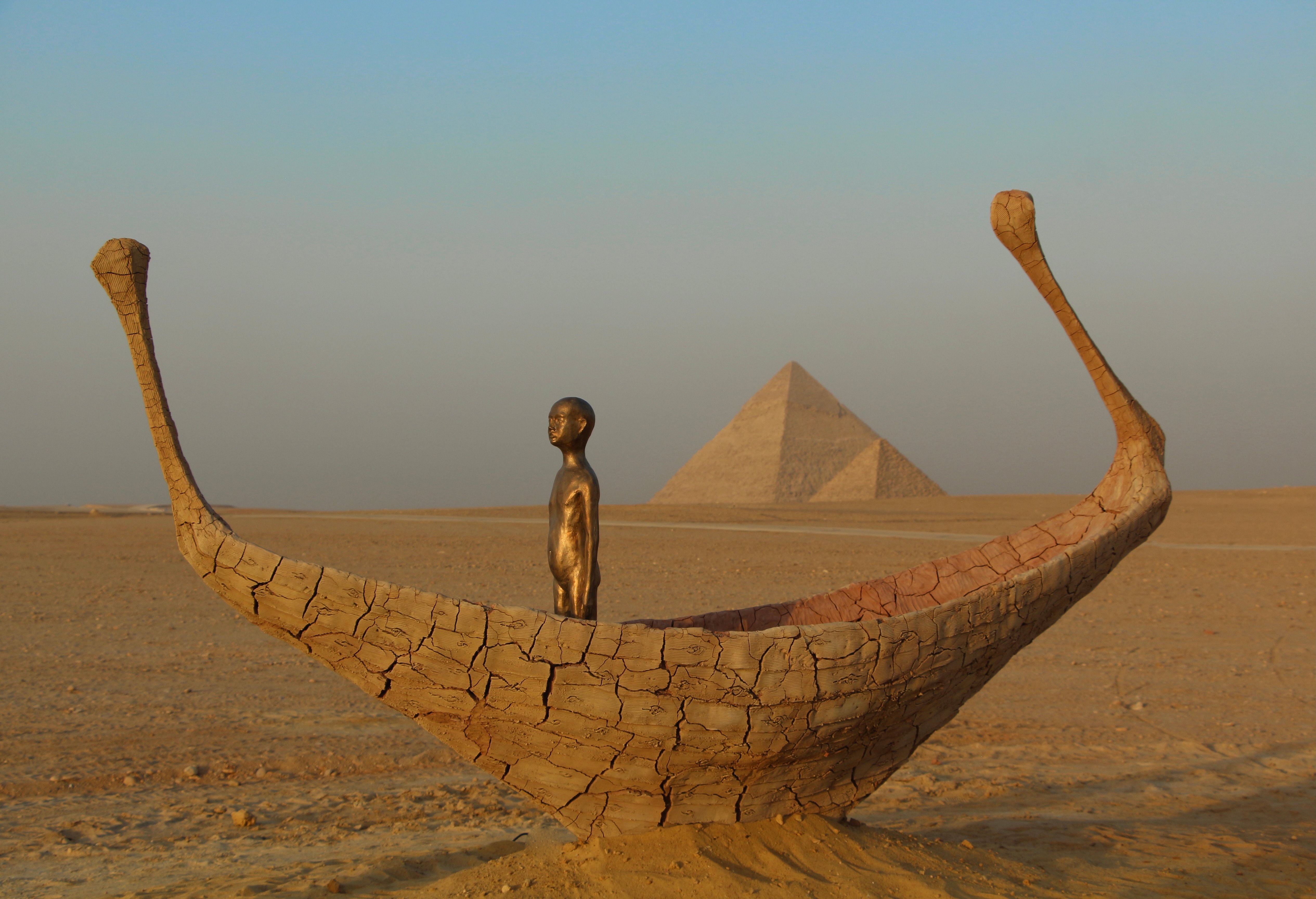 Made from Nile ochre clay, this traditional river boat with a solitary bronze figure was inspired by the solar barque of Khufu unearthed on the Giza Plateau, emblematic of boats buried near royal tombs that served as ritual vessels ferrying the resurrected across the skies. “The boat is a metaphor of life and death and East and West and looking from the West to the promise of the new,” explains Appriou who, as a child, dreamed of being an Egyptologist and often refers to Egyptian sculpture in his body of work. “The boat of Khufu is an iconic relic that has survived all these years. I wanted to do a special piece, very powerful, and it will disappear like the ephemeral quality of life.”