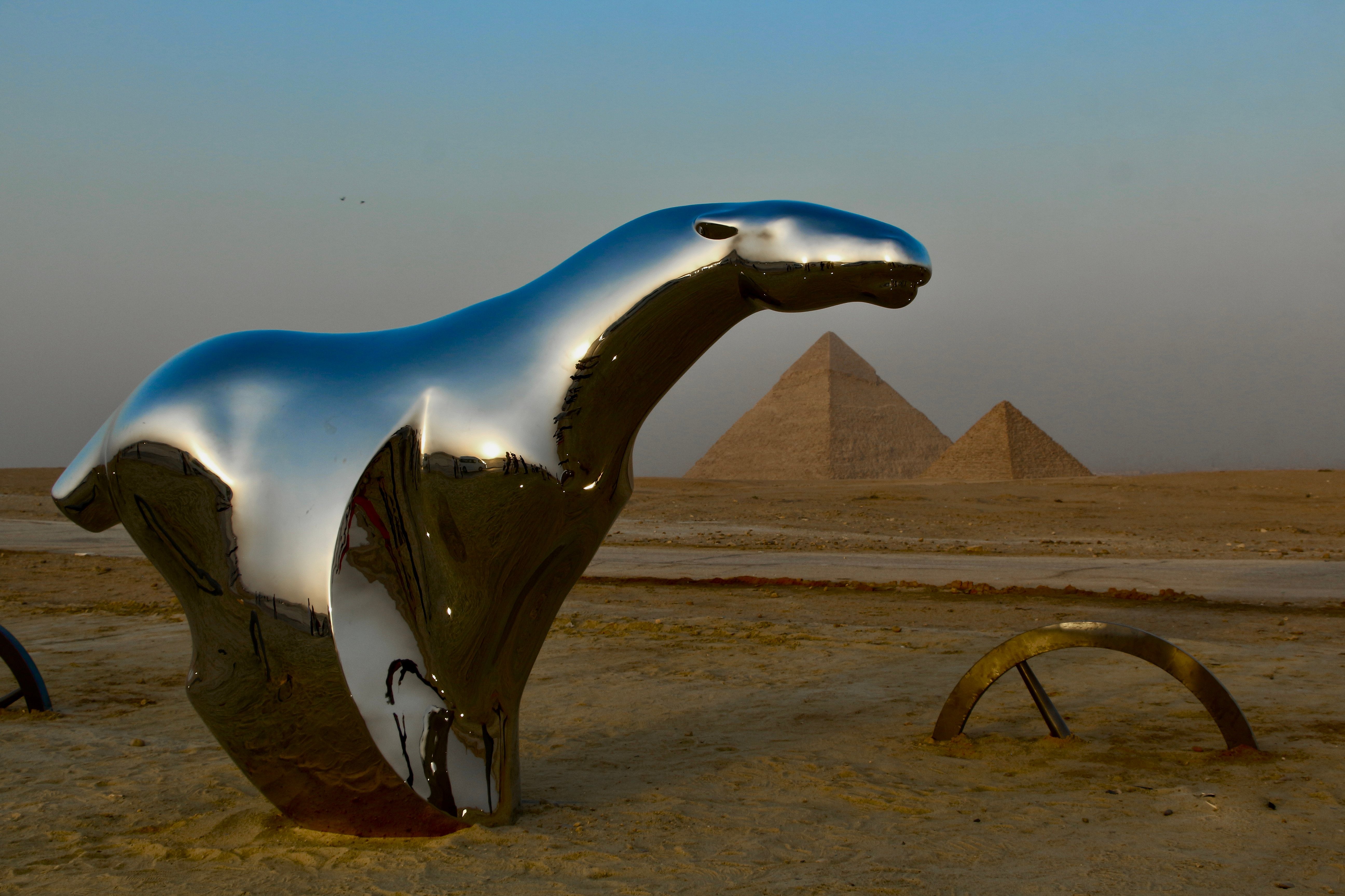 Reminiscent of ancient Egyptian chariots, a pair of stainless steel horses races through the desert with semicircular wheels emerging from the sand beneath. In the artist’s hands it’s an expression of human invention that led to navigation and discovery of unknown lands and the mapping of the skies. “They are step by step in the sand cause it reflects the old technology and civilizations not able to reach the kind of high tech which is squeezing everybody,” says Zaki, who did the original series in marble. “I wanted to magnify it and use reflective stainless steel so it looks like something very technological and modern or a spaceship or satellite.”
