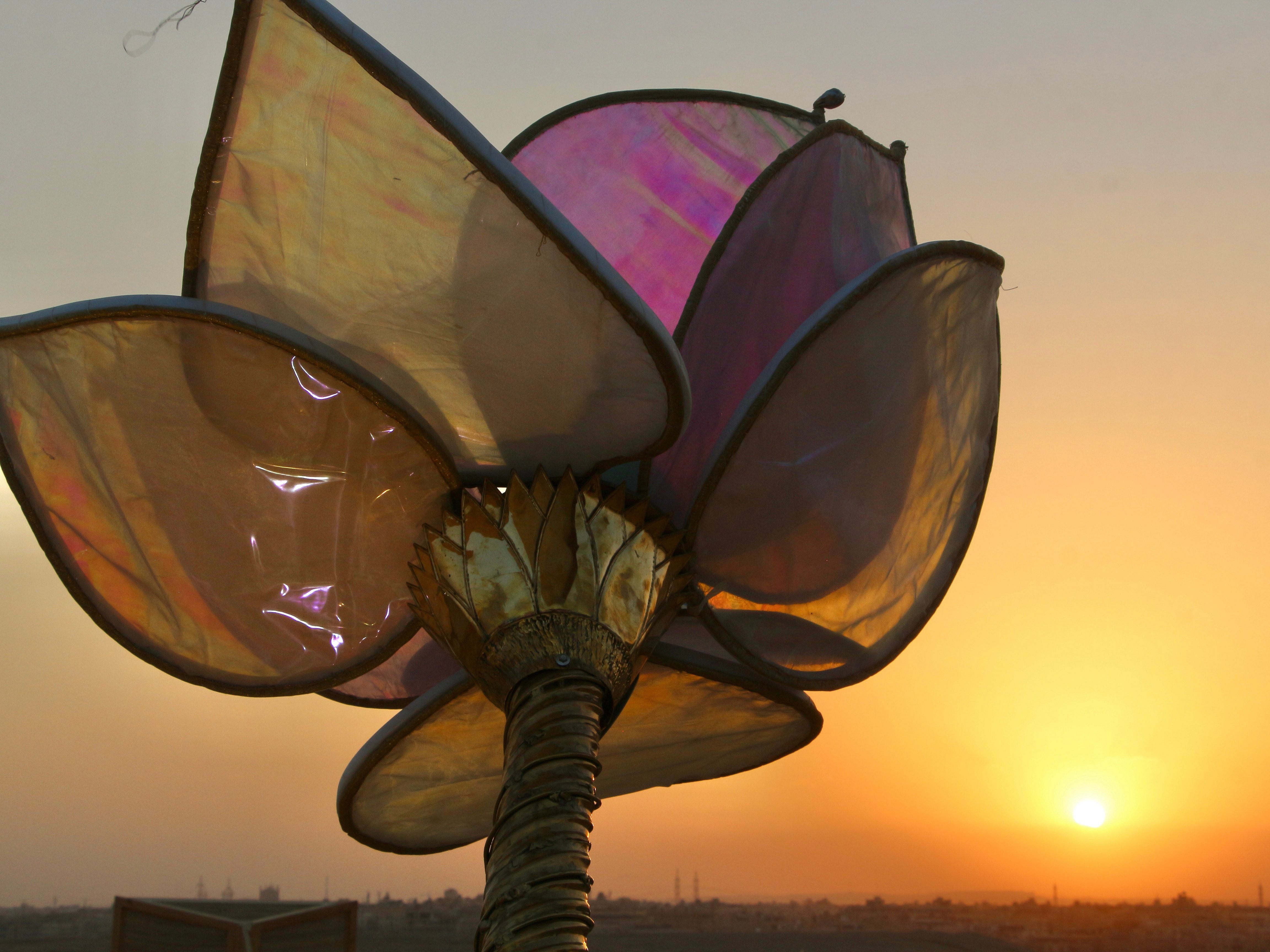 Suleman’s garden of ten giant blue lotuses made of brass, with petals made of silk and holographic film, uses pulse sensors to visualize visitors’ heartbeats. Based on her 2014 installation, “Pulse & Bloom” at Burning Man, “Padma/Lotus” is rooted in the ancient text of the Vishnu Purana in which a lotus emerged from the navel of a god and marked the creation of the universe. It’s matched in Egyptian lore in which a blue lotus arose out of primeval waters at the beginning of time, connecting the heavens to the Earth. Prophecies declare that when the blue lotus blooms in Egypt there will be a rebirth of consciousness rooted in the purity of the heart.