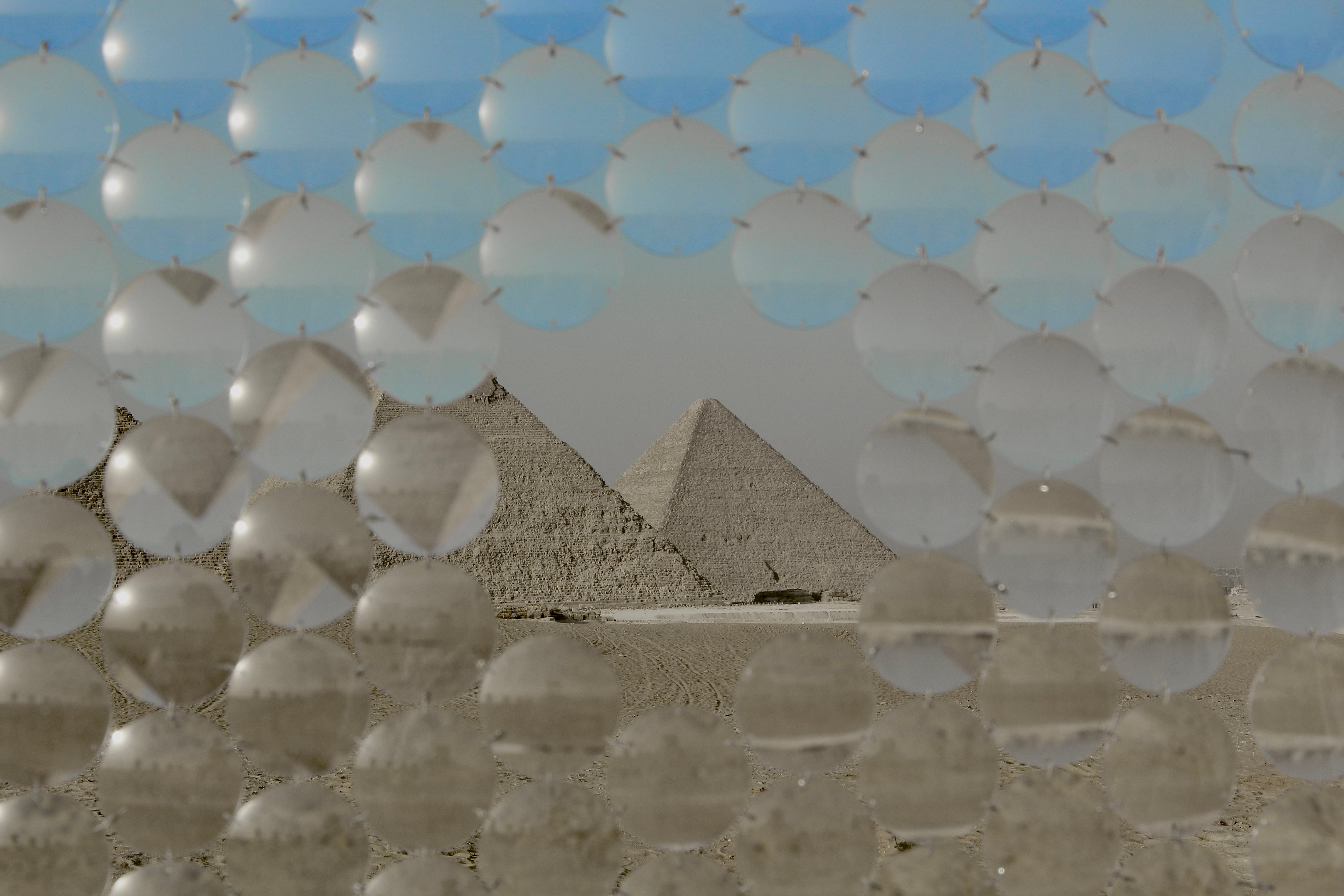 Federica Di Carlo’s installation takes its cues from Egyptian mythology wherein the Sun God Ra shed tears from which humankind sprung forth. A large eye composed of thousands of graduated optical lenses through which the world appears upside down surrounds an opening that frames the pyramids.