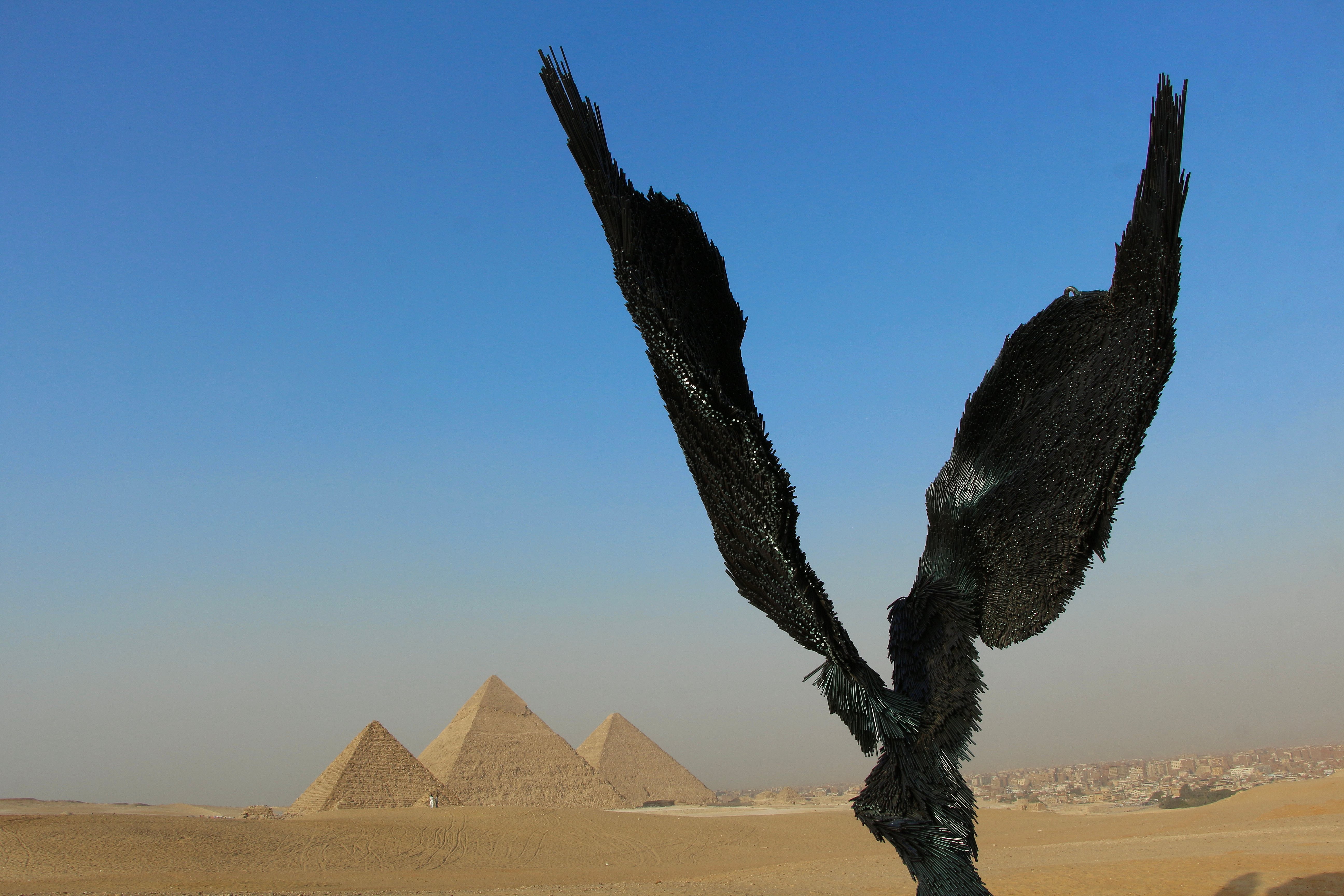 Art D’Égypte’s “Forever is Now” is once again turning heads at one of the world’s most breathtaking landmarks, the Great Pyramids in Giza, Egypt. Now in its fourth year, the epic art exhibition—which runs through November 15—features 12 artists from around the world presenting installations that range from abstraction (Chris Levine’s “Quadrivium”), to practical (Marie Khouri’s benches, “I Love”), with themes stretching from the ancient past to the present day.
