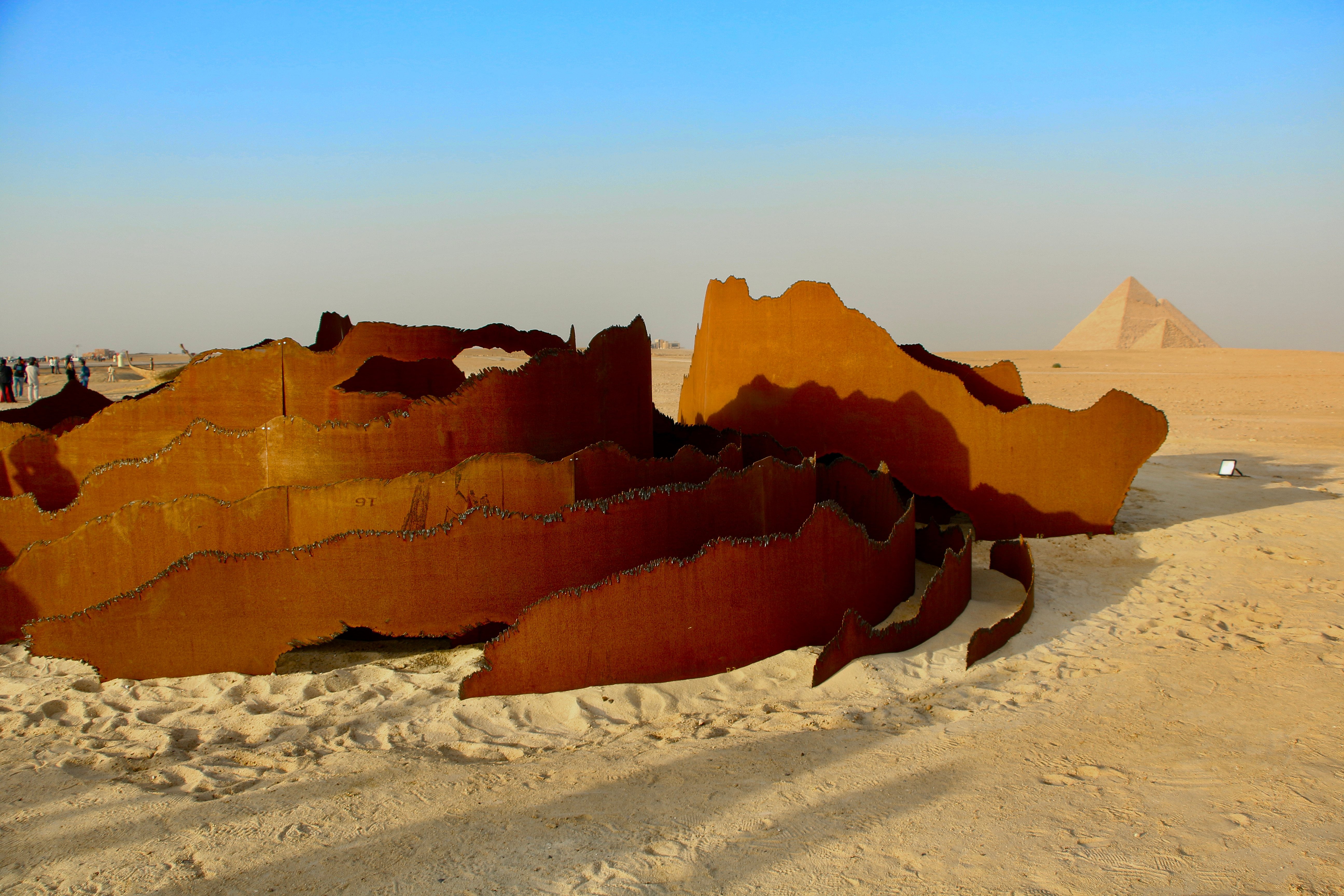 Boghossian’s oeuvre straddles the cross-section of creation and destruction. In his practice, fire often transforms materials, commenting on the ephemeral nature of existence, just as the rust in “Desert Waves,” with its curvy steel slats emerging from the sand, illustrates the impermanence of a material that epitomizes permanence. “In Egypt you have sand waves and you have waves of the ocean, but those are busy. We avoid violence,” says the artist, who splits his time between Belgium and his home country of Lebanon, now the target of Israeli bombs. “We are sick of violence we need to have peaceful means. I call them the waves of calligraphy, music and the waves of literature, of poetry. Art is the answer. With art you can disagree, but you don’t need to kill. You can have a glass of wine and talk about it.”