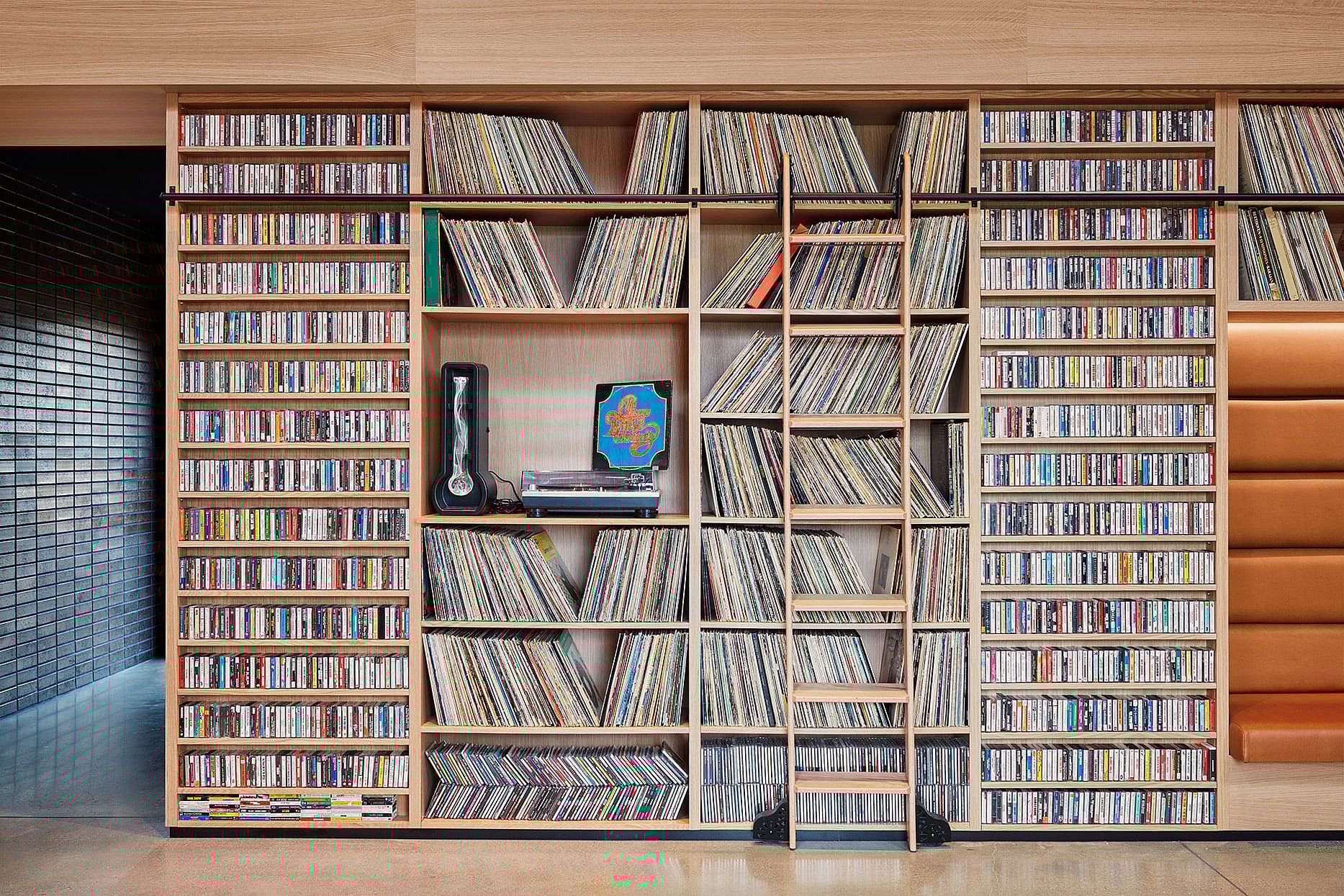 The Soundbooth lobby bar greets guests with a nod to Asbury Park’s storied musical history, featuring a striking wall of vintage cassette tapes and vinyl albums that vie for attention with “Springsteen for President” t-shirts for sale behind the front desk and a poster for a Golden Girls drag trivia night.