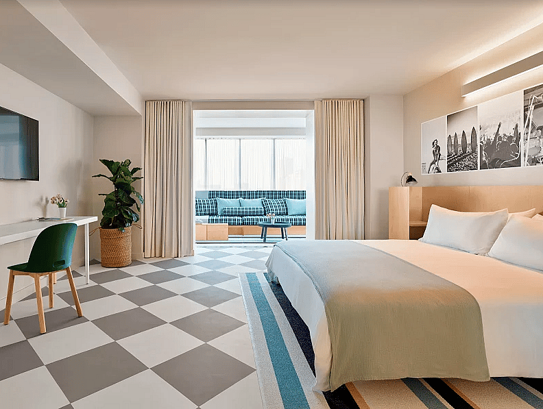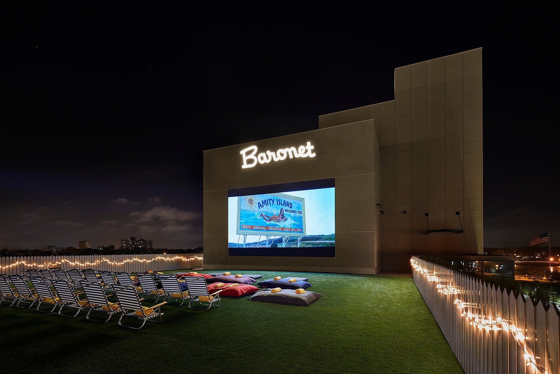 Perhaps the hotel’s most unique feature is The Baronet, a 4,300-square foot rooftop space blanketed in artificial lawn that transforms into a “carless drive-in movie theater” after dark. Playfully designed as a miniature version of Central Park’s Great Lawn, the Baronet is adorned with social distancing decal squares inspired by the circles in New York City’s Domino Park. Guests can take yoga classes during the day and lounge in beanbag chairs watching classic movies like Jaws, Psycho and E.T. on the 20-foot screen during sunset screenings overlooking the Atlantic Ocean.