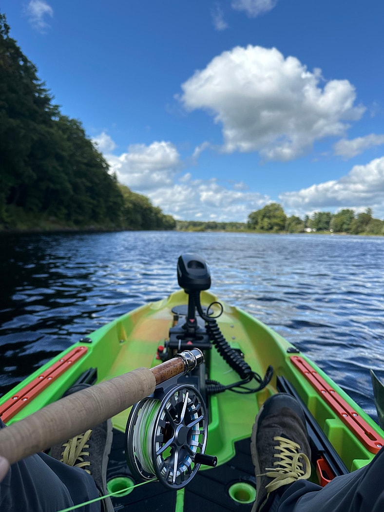 I had never been fly fishing from a kayak before, and the idea intimidated me. Turns out my definition of “kayak” needed an update. What Lilly trailered to the Penobscot was a pair or Old Town Autopilot kayaks, which not only eliminate the need to paddle, but have a GPS anchor system that will lock you in place so you can ignore everything but your casting. Traversing the lake with a quiet electric motor doesn’t interrupt the vibe or scare the fish, and I caught several small mouth bass on the Maine Fly Rod, and the fight they put up is a lot of fun.