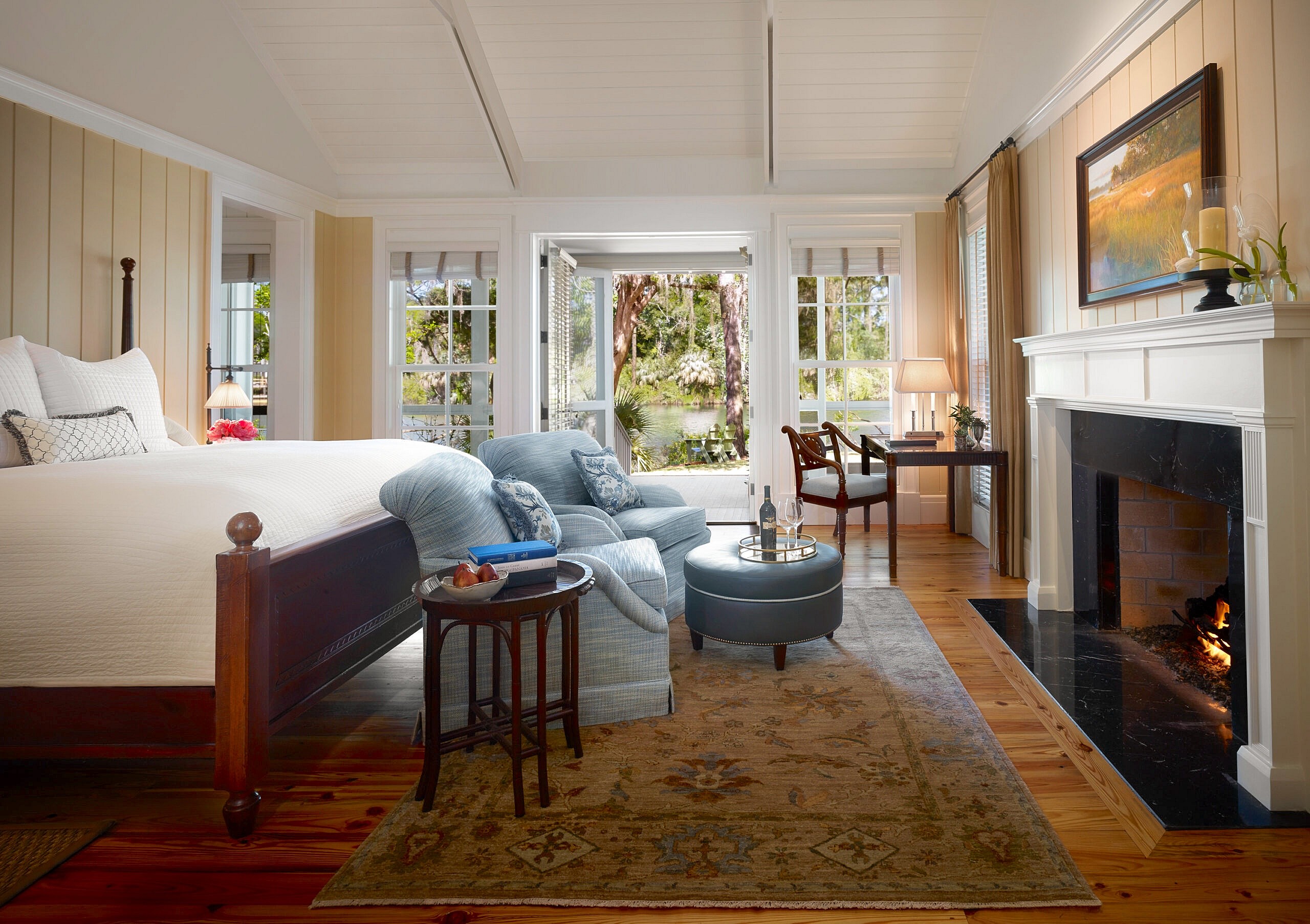 With 32 miles of waterfront it’s surrounded by a lazy river, wetlands, and pine forests, it abounds in natural beauty, with a protected wildlife preserve laced with walking bridges, waterways, and ancient live oaks draped in Spanish moss. Exotic birds flit everywhere. You may even sight an alligator along the drive leading to the quintessentially Southern-style inn.